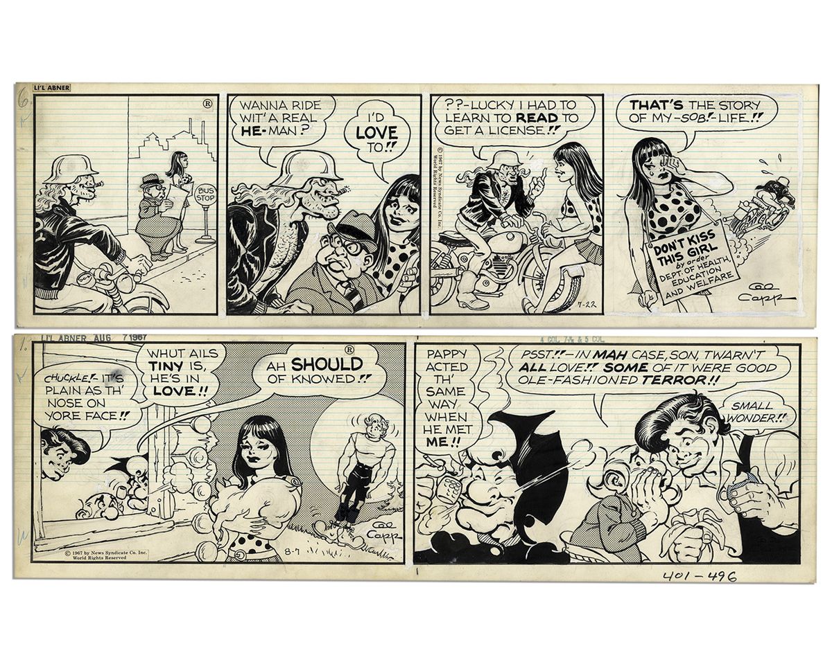 ''Li'l Abner'' Pair of 1967 Comic Strips Hand-Drawn & Signed by Al Capp -- Featuring Rare Character Marcia Perkins, Yokums & Salomey -- 19.75'' x 6.25'' -- White-Out & Toning, Near Fine
