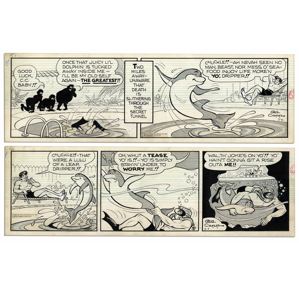 ''Li'l Abner'' Pair of Comic Strips Drawn & Signed by Al Capp From 6 & 7 May 1966 -- Featuring Li'l Abner & a Dolphin Named Dripper -- 19.75'' x 6.25'' -- Toning, Else Near Fine