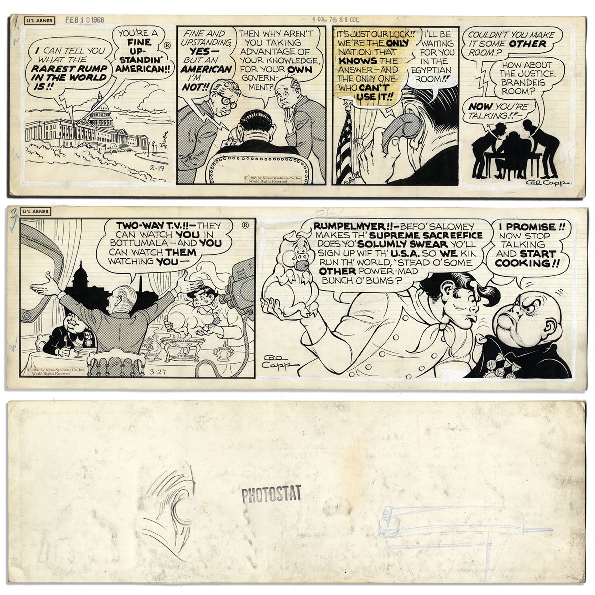 ''Li'l Abner'' Pair of Comic Strips From 1968 -- Hand-Drawn & Signed by Al Capp -- Featuring Li'l Abner in One Strip -- 22.5'' x 7'' -- White Out & Toning, Near Fine