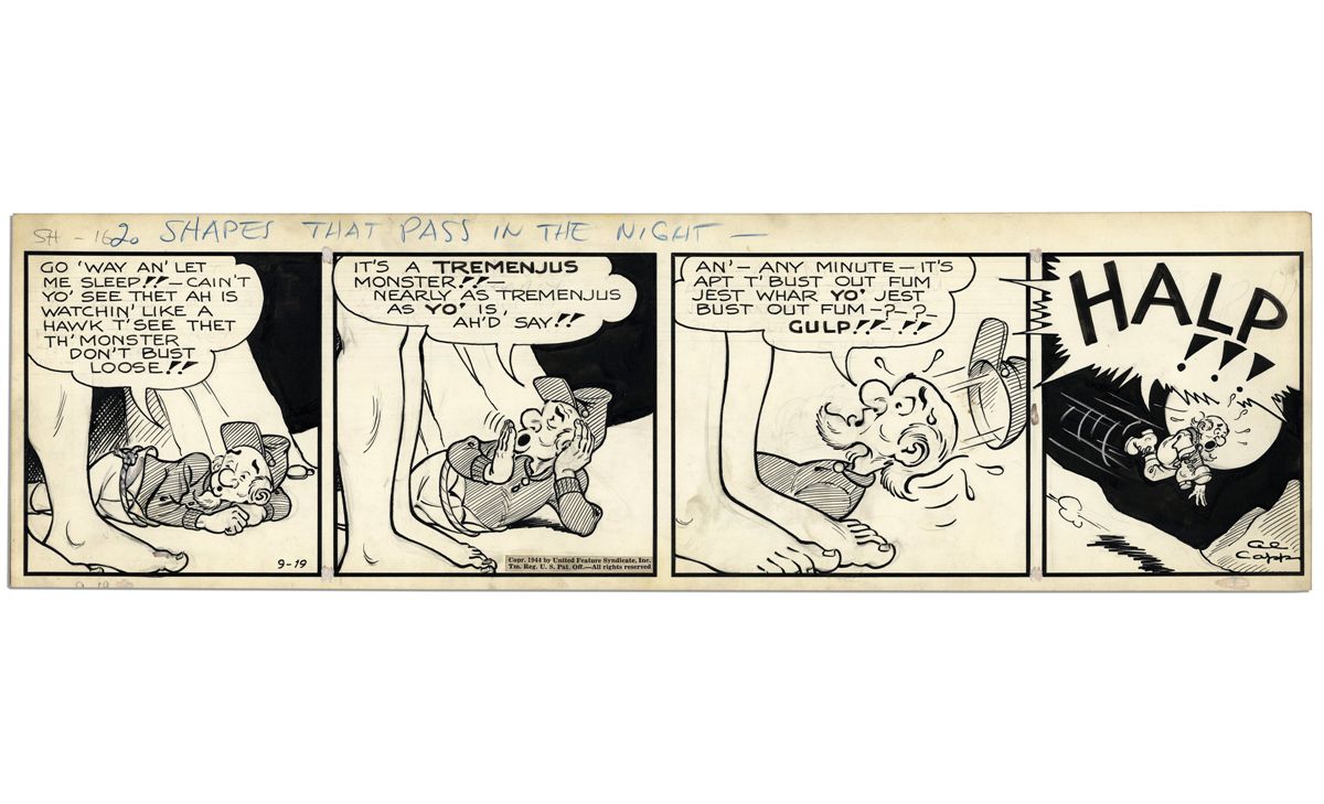 ''Li'l Abner'' Strip Hand Drawn & Signed by Al Capp From 19 September 1944 -- Featuring Pappy Yokum & The Legs of a Giant Woman -- 22.75'' x 6.75'' -- Toning, Else Near Fine