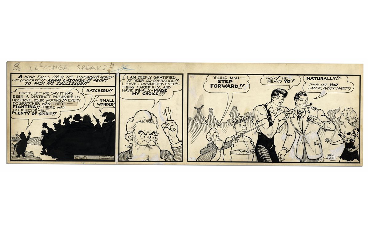 ''Li'l Abner'' Strip Hand Drawn & Signed by Al Capp -- From 21 July 1940 -- Featuring Dogpatch Ladies' Man Adam Lazonga, Li'l Abner & Daisy Mae -- 23'' x 6.75'' -- Toning, Else Near Fine
