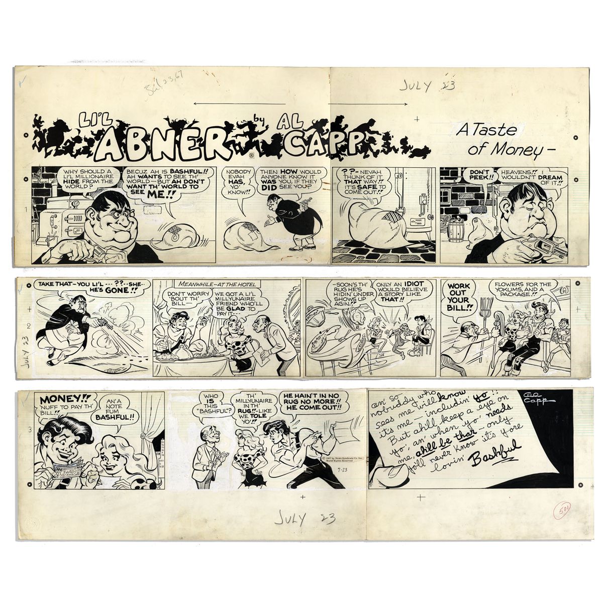 ''Li'l Abner'' Sunday Strip Hand-Drawn & Signed by Al Capp From 23 July 1967 -- Featuring Li'l Abner, Daisy Mae & Bashful Yokum -- 29'' x 23'' On Three Separated Strips -- Near Fine