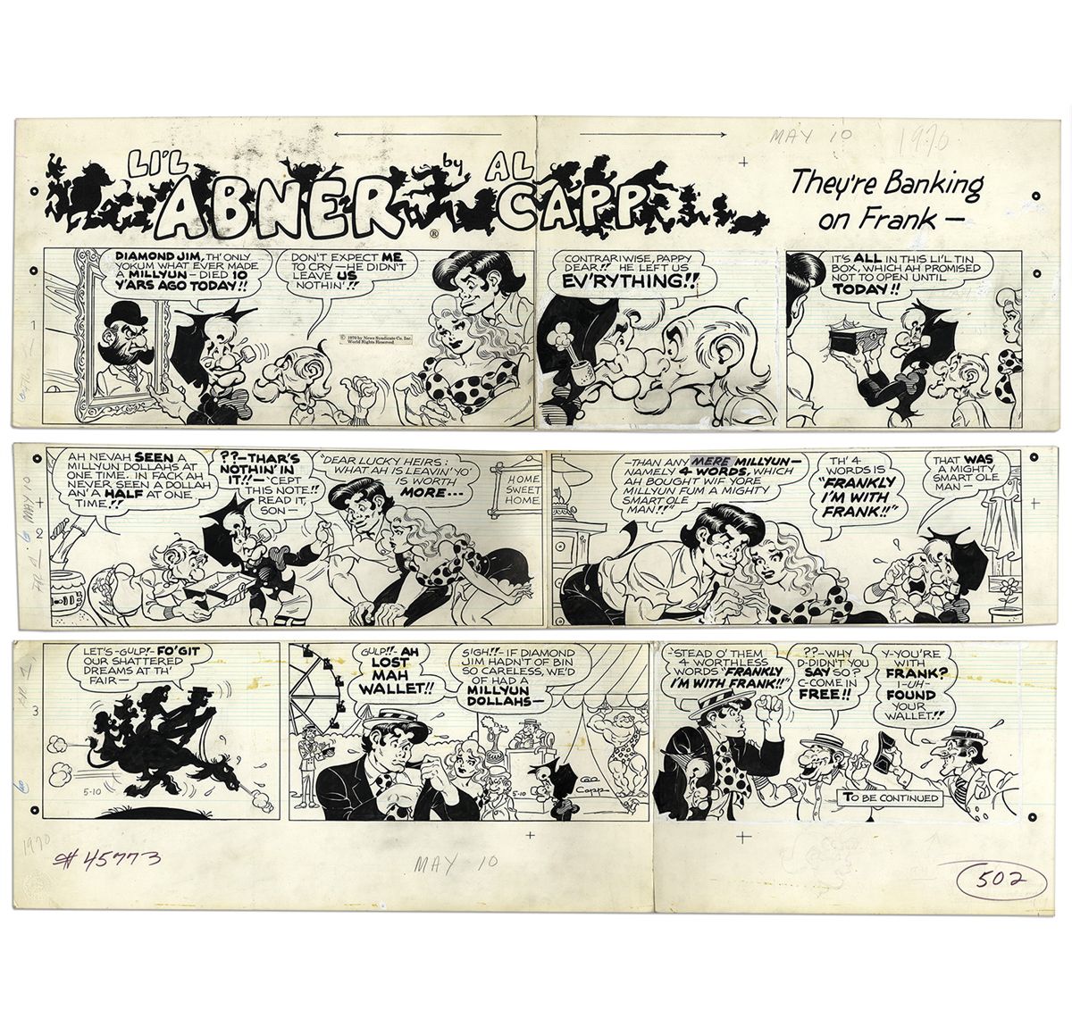 ''Li'l Abner'' Sunday Strip Hand-Drawn by Al Capp From 10 May 1970 -- Featuring The Yokum Family -- With Sketches to Verso -- 29'' x 23'' On Three Separated Strips -- Very Good