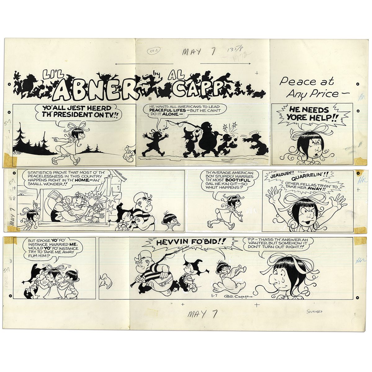 ''Li'l Abner'' Sunday Strip Hand-Drawn by Al Capp From 7 May 1972 -- Featuring Honest Abe -- 29'' x 23'' On Three Separated Strips -- Very Good