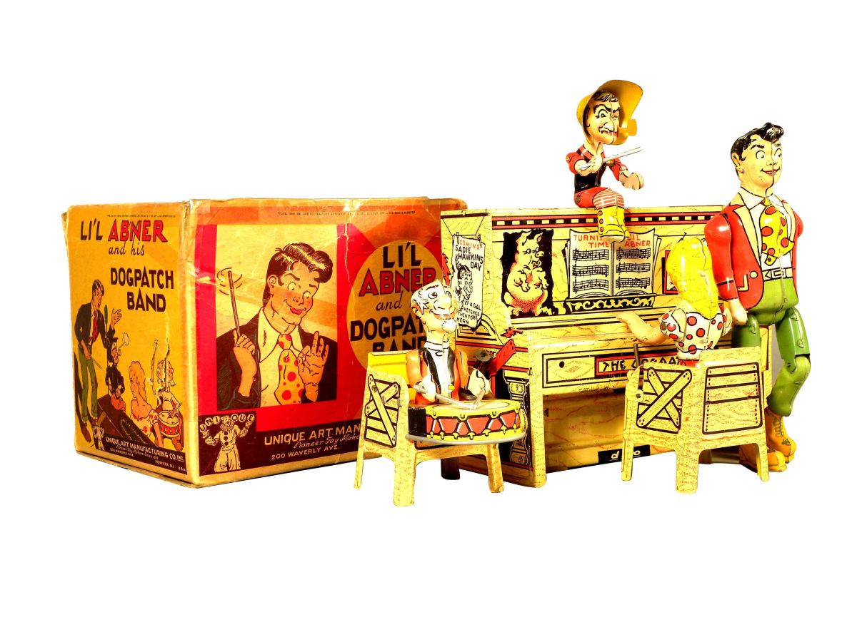 Li'l Abner and his Dogpatch Band Tin Wind Up Toy in original box. Unique Art Mfg Company, Newark, NJ. Excellent condition, box has no lid (fair). Box measures 7 1/2 X 6 X 6 inches.