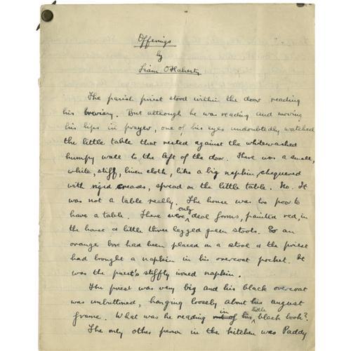 <B>Liam O'Flaherty Handwritten and Signed Short Story</B></I> titled <I>Offerings.</B></I> O'Flaherty was a leading 20th century Irish novelist and short story writer and a major figure in the Irish Renaissance. Though a Communist sympathizer and against all organized religions, he spent several years of his early life training for the priesthood. This story is about a parish priest and is seven pages in length, handwritten on lined paper, 6.25" x 8", very good condition. Likely unpublished.