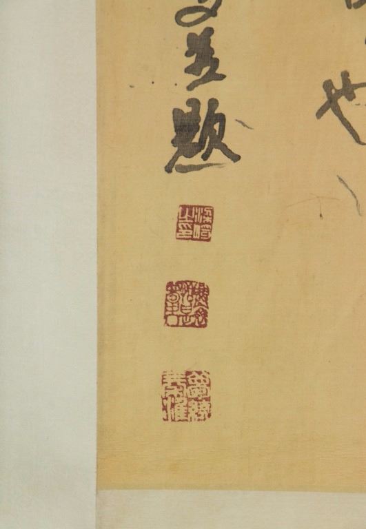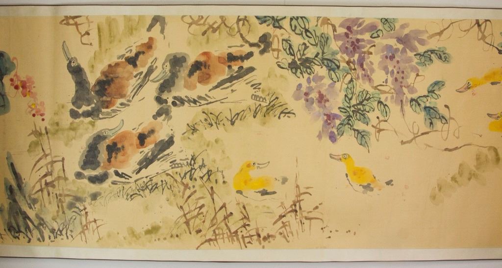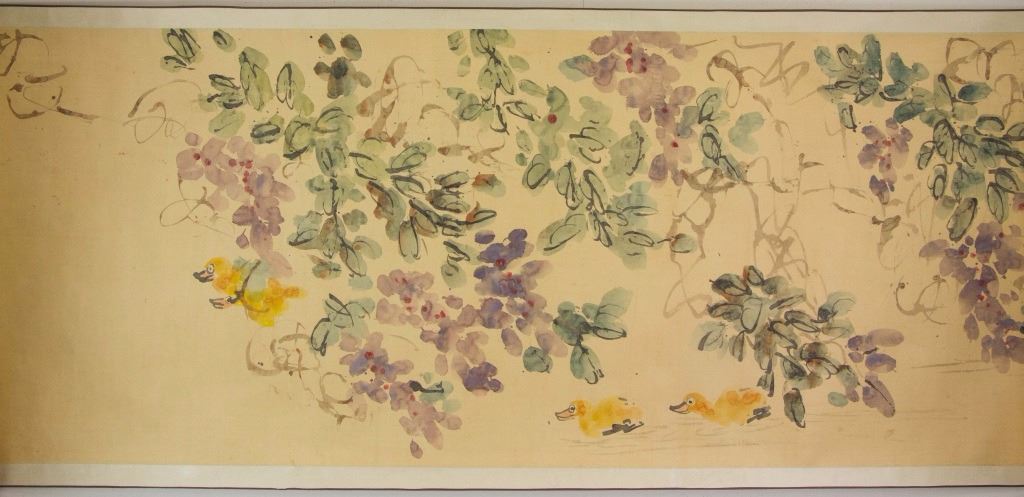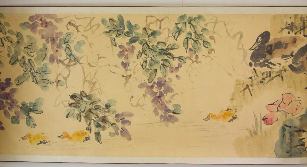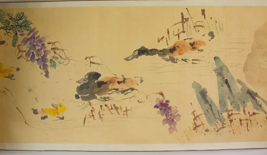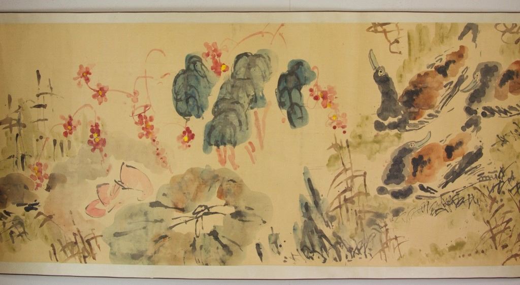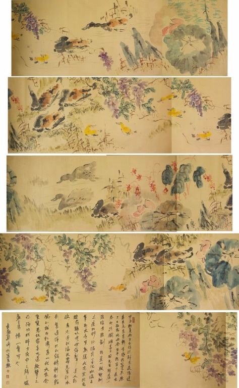 Scene of pond in early summer including lotus, duck and flowers; Chinese ink and watercolour on silk; hand scroll; signed Liang Qi; inscribed with 4 artist seals; 64 cm x 780 cm