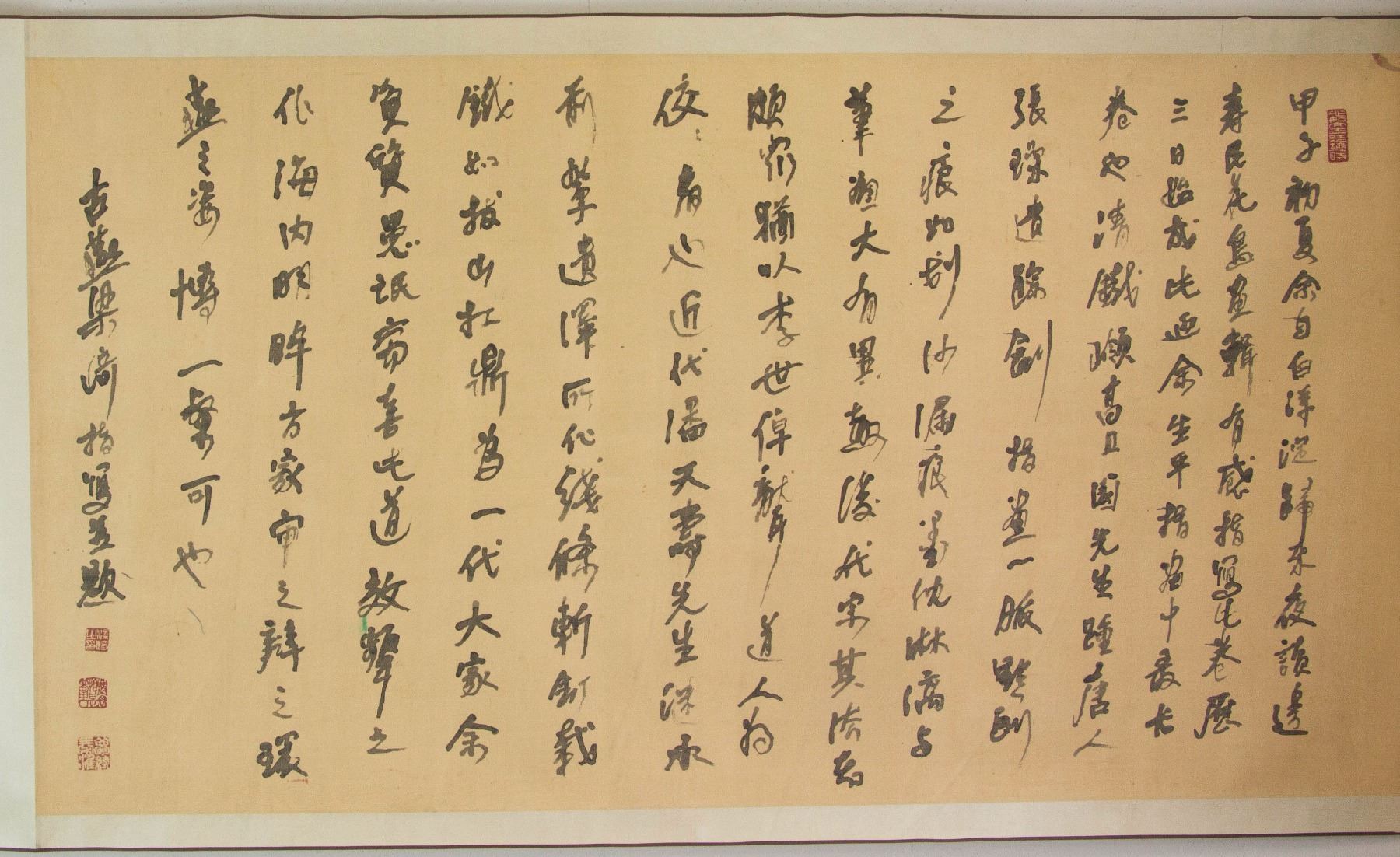 Scene of pond in early summer including lotus, duck and flowers; Chinese ink and watercolour on silk; hand scroll; signed Liang Qi; inscribed with 4 artist seals; 64 cm x 780 cm