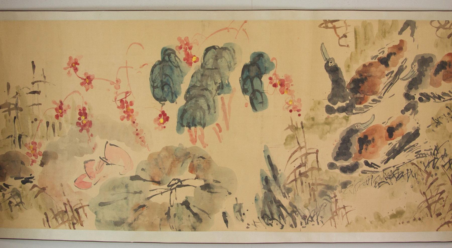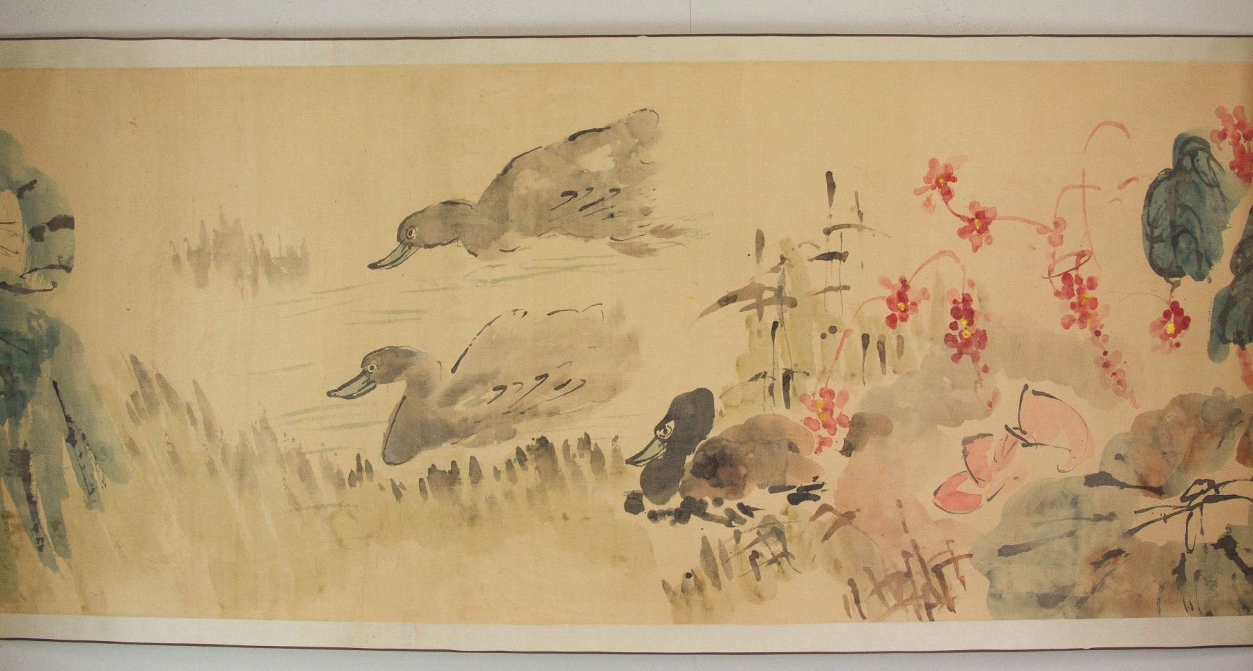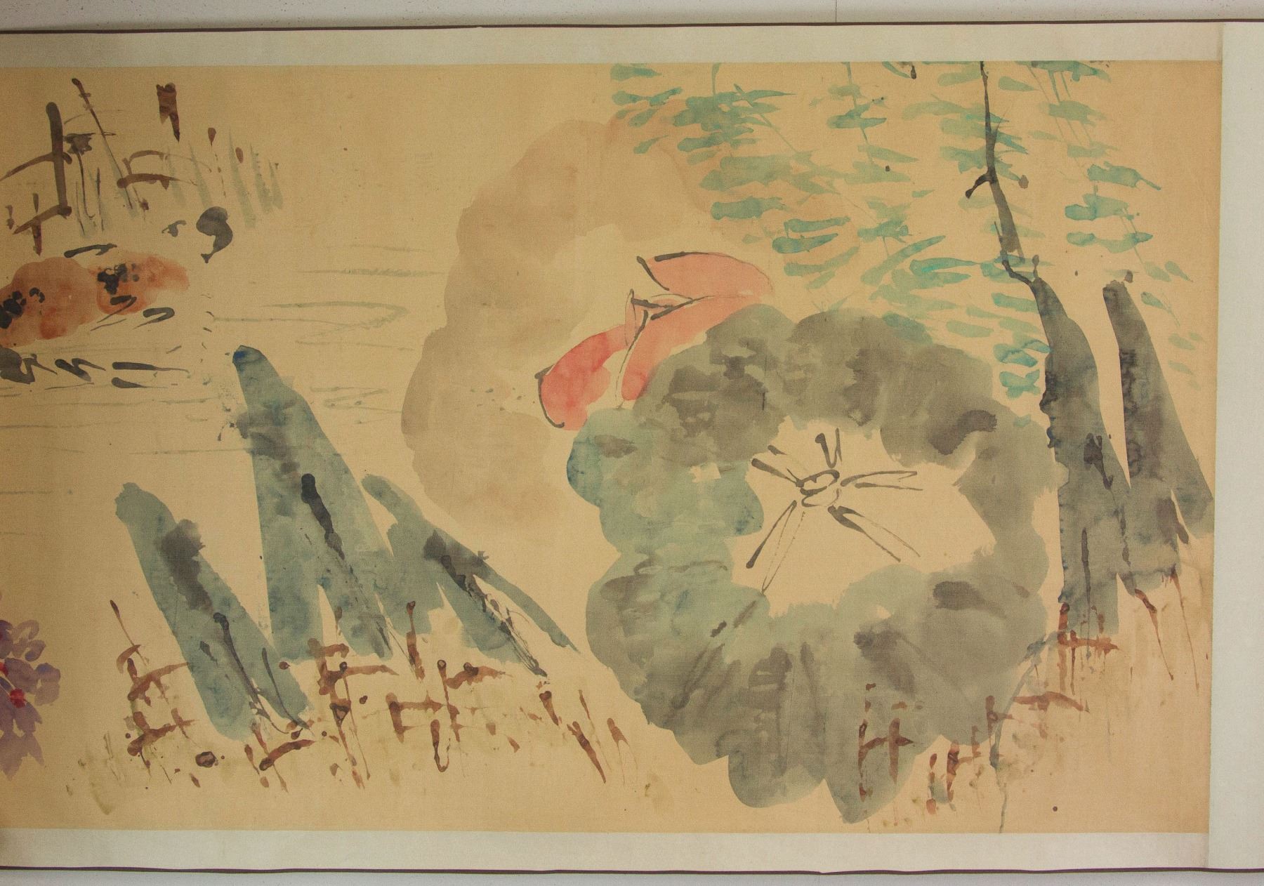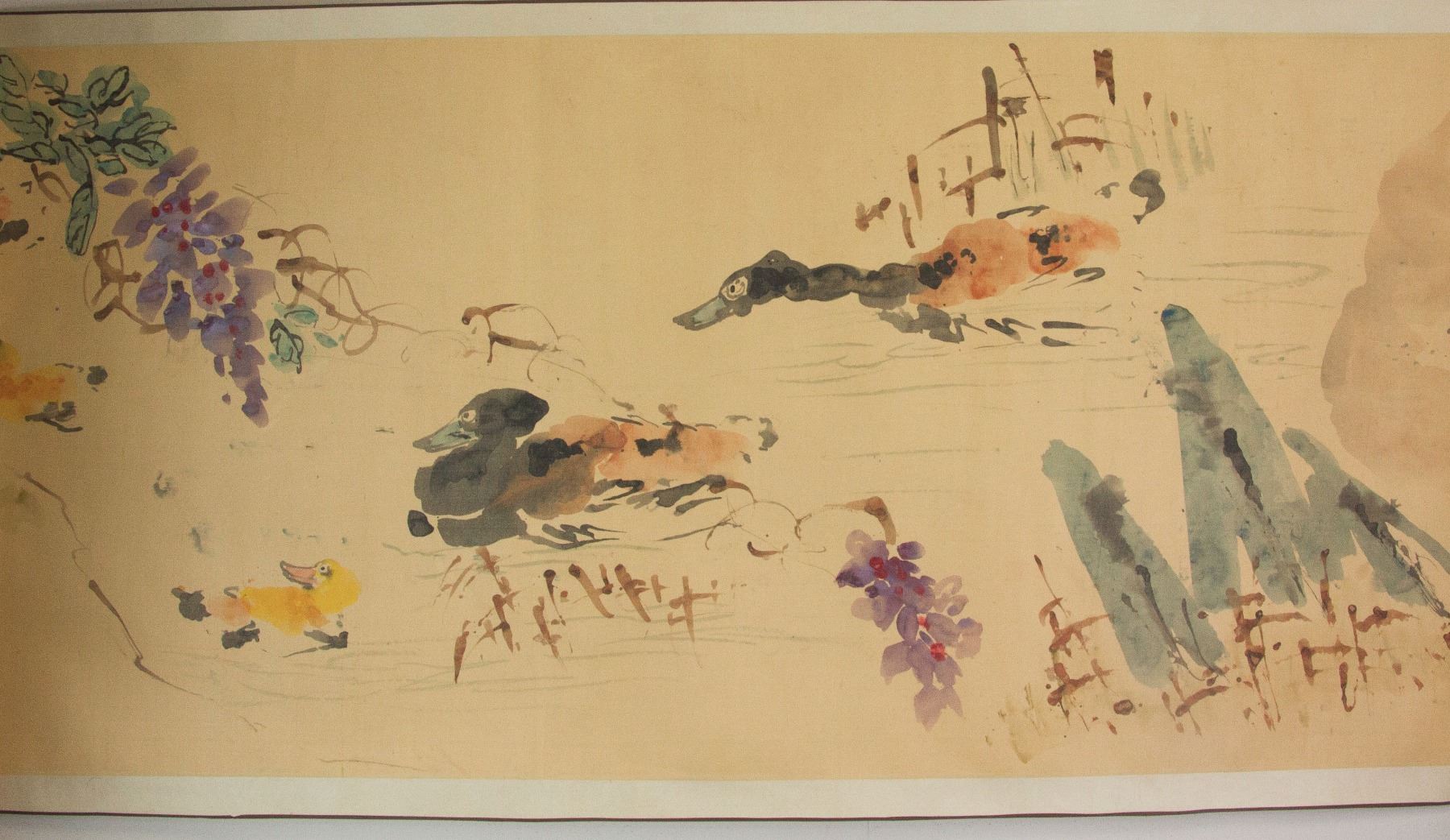Scene of pond in early summer including lotus, duck and flowers; Chinese ink and watercolour on silk; hand scroll; signed Liang Qi; inscribed with 4 artist seals; 64 cm x 780 cm