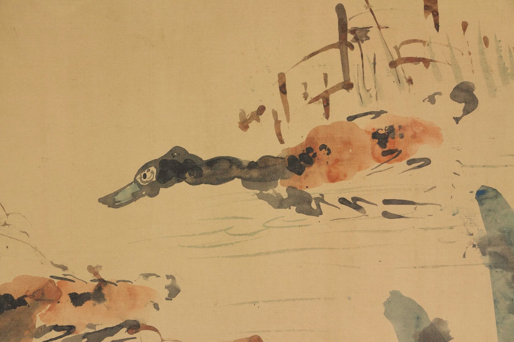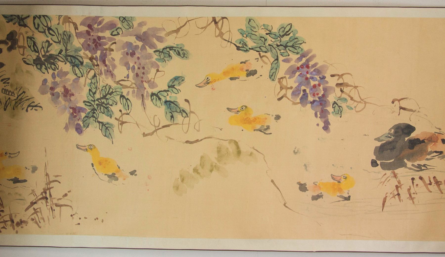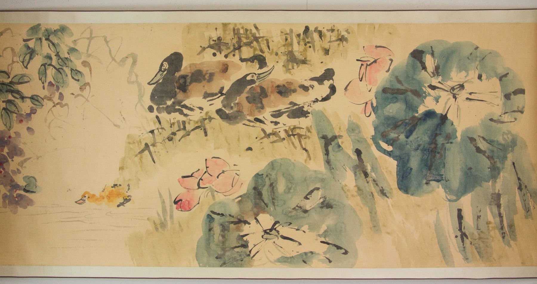 Scene of pond in early summer including lotus, duck and flowers; Chinese ink and watercolour on silk; hand scroll; signed Liang Qi; inscribed with 4 artist seals; 64 cm x 780 cm