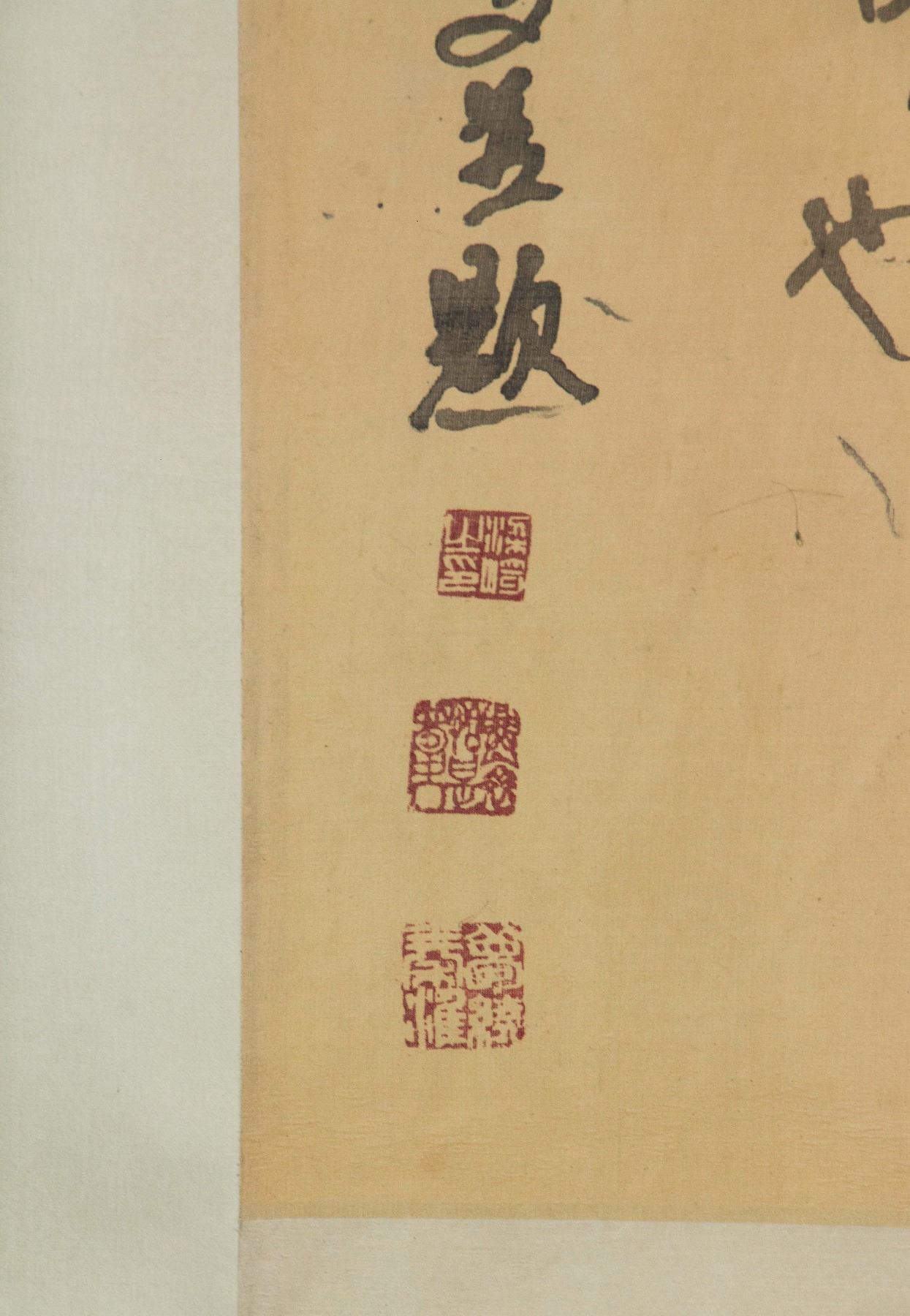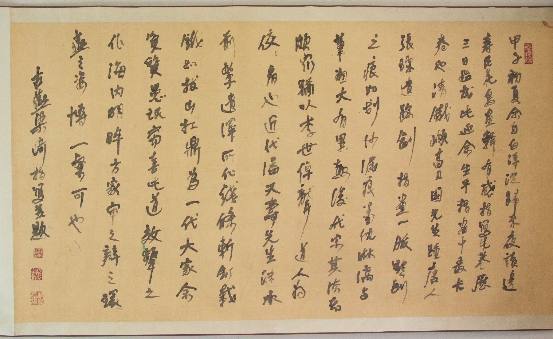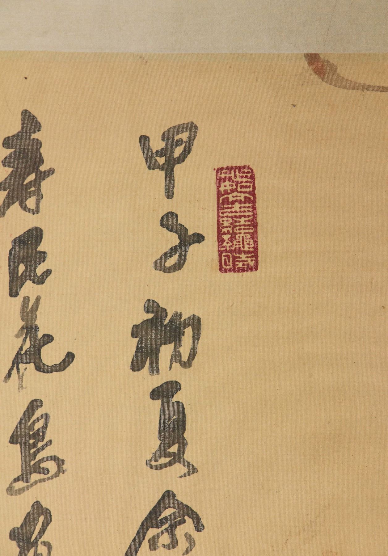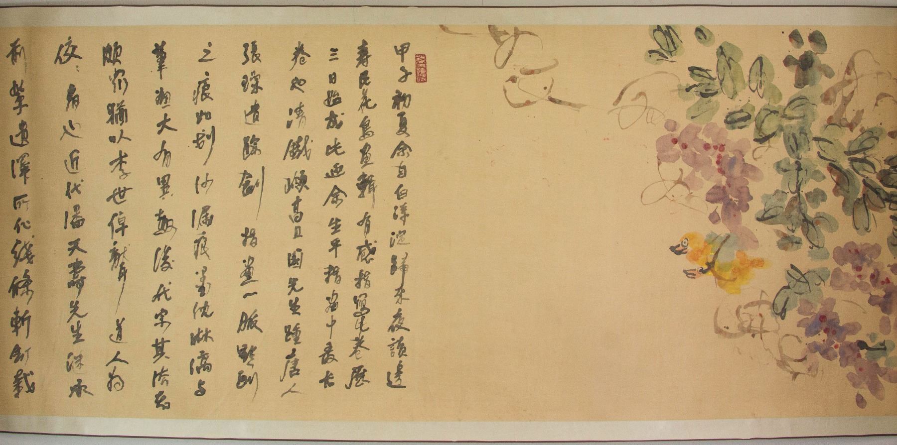 Scene of pond in early summer including lotus, duck and flowers; Chinese ink and watercolour on silk; hand scroll; signed Liang Qi; inscribed with 4 artist seals; 64 cm x 780 cm