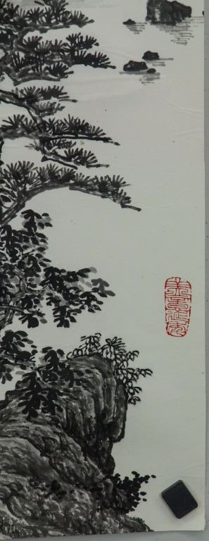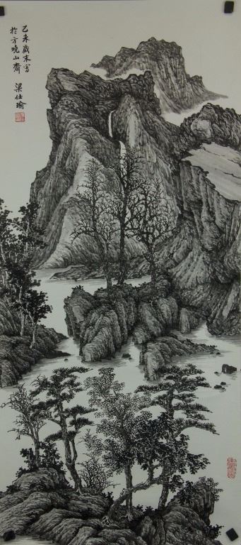 Mountainous landscape with pine trees; Chinese ink on paper; signed Liang Shiyu (b.1945); inscribed with 2 artist seals; 122 cm × 56 cm