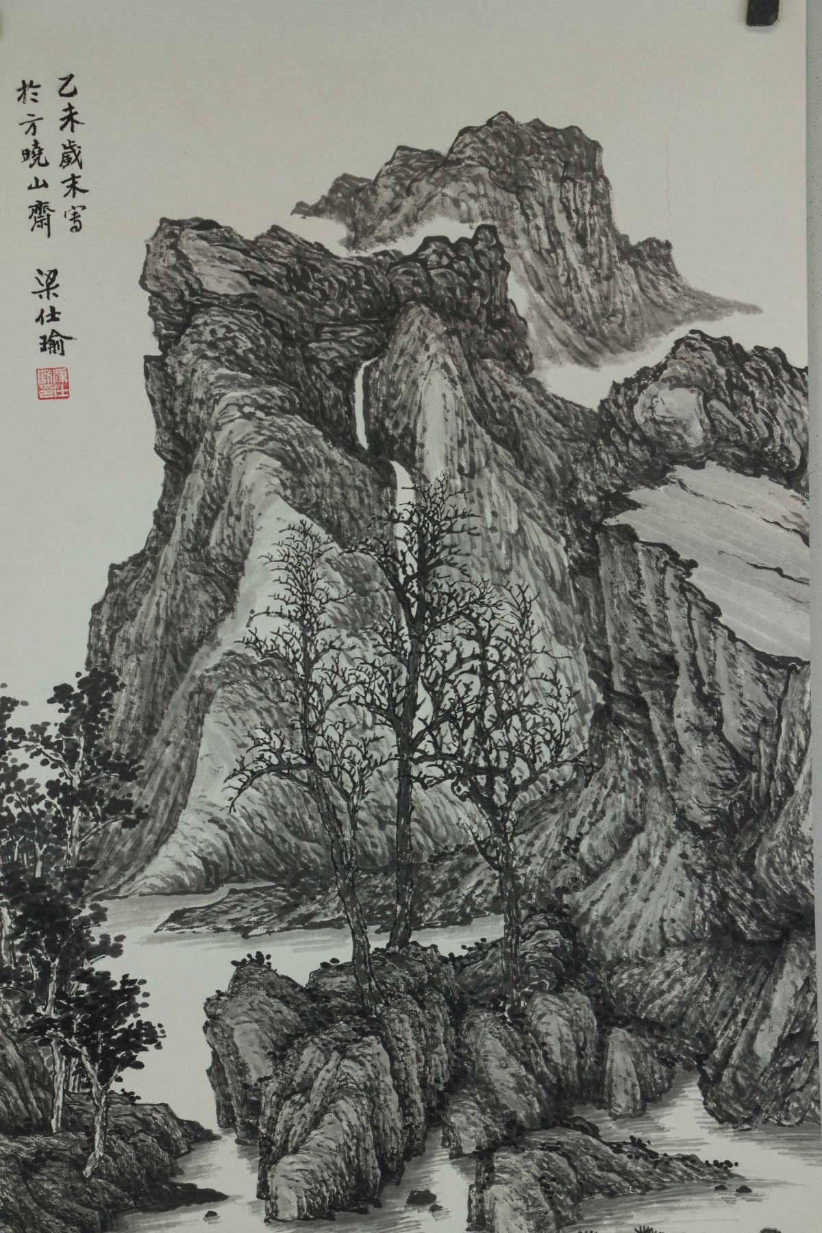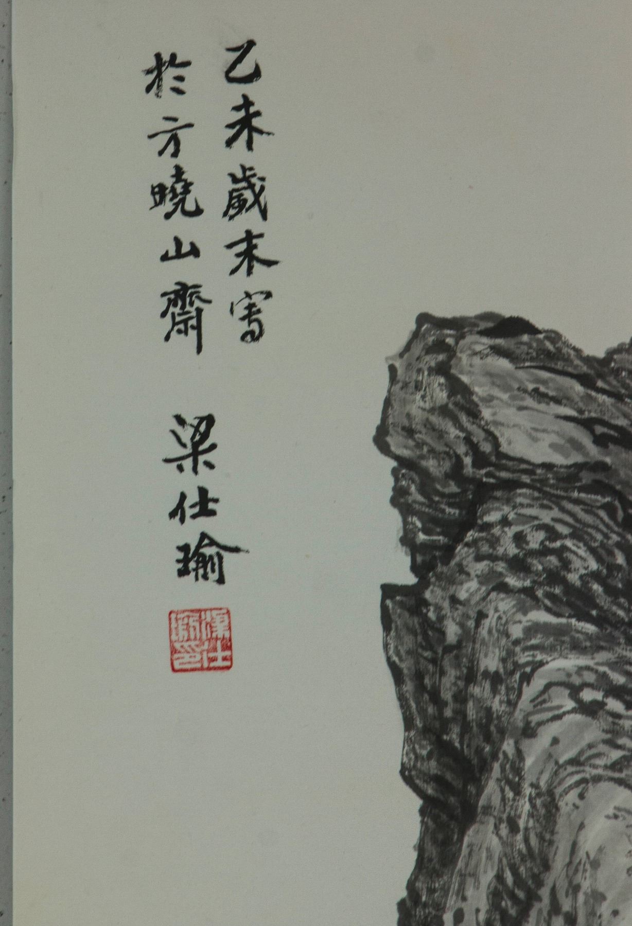 Mountainous landscape with pine trees; Chinese ink on paper; signed Liang Shiyu (b.1945); inscribed with 2 artist seals; 122 cm × 56 cm