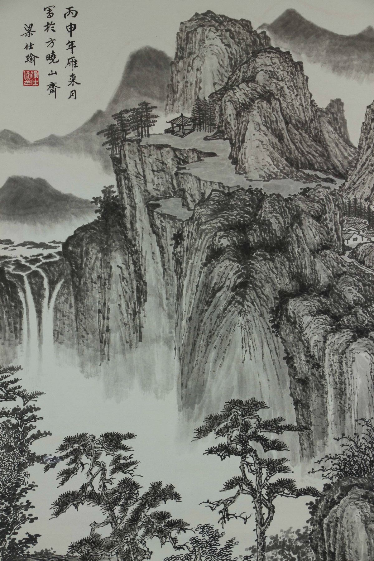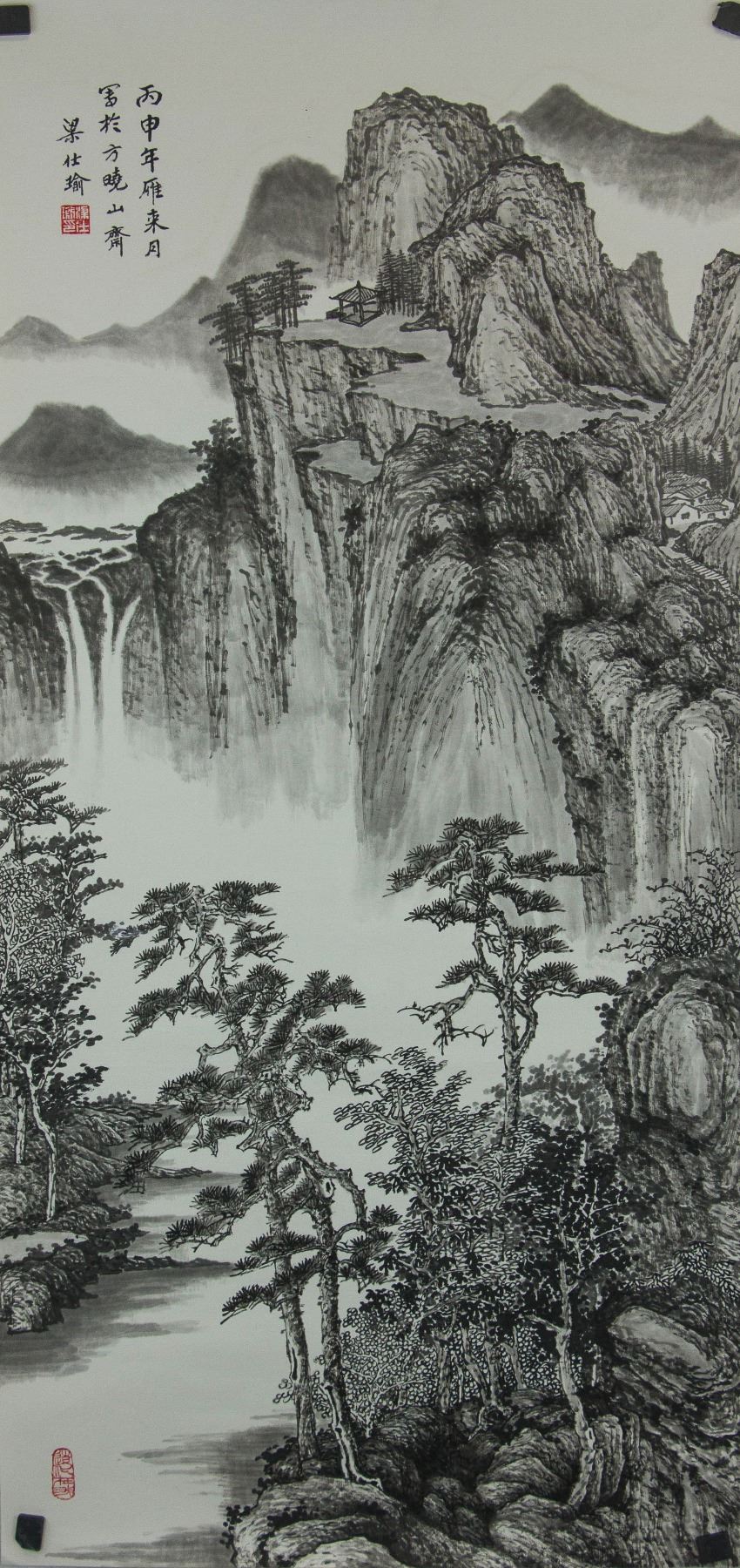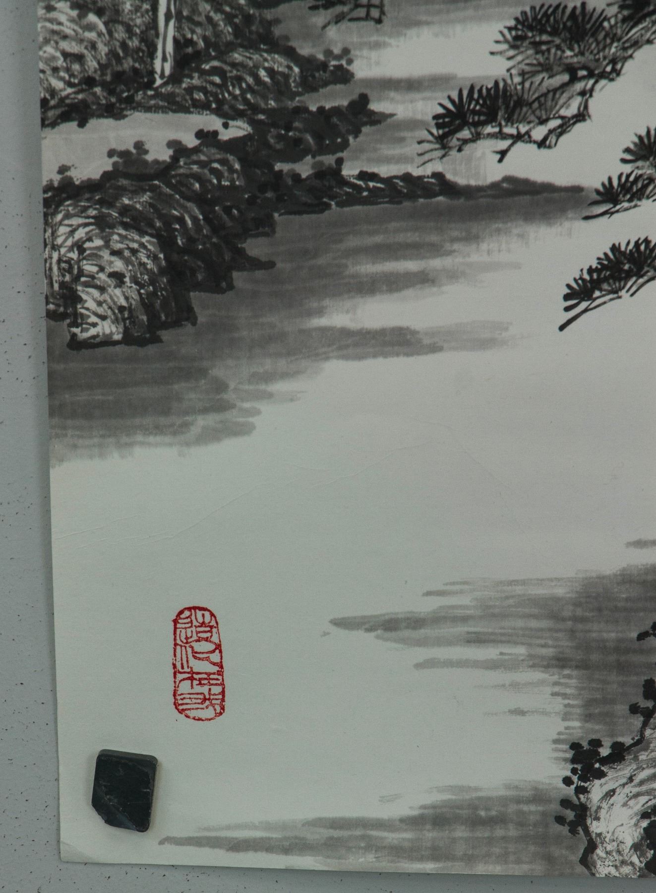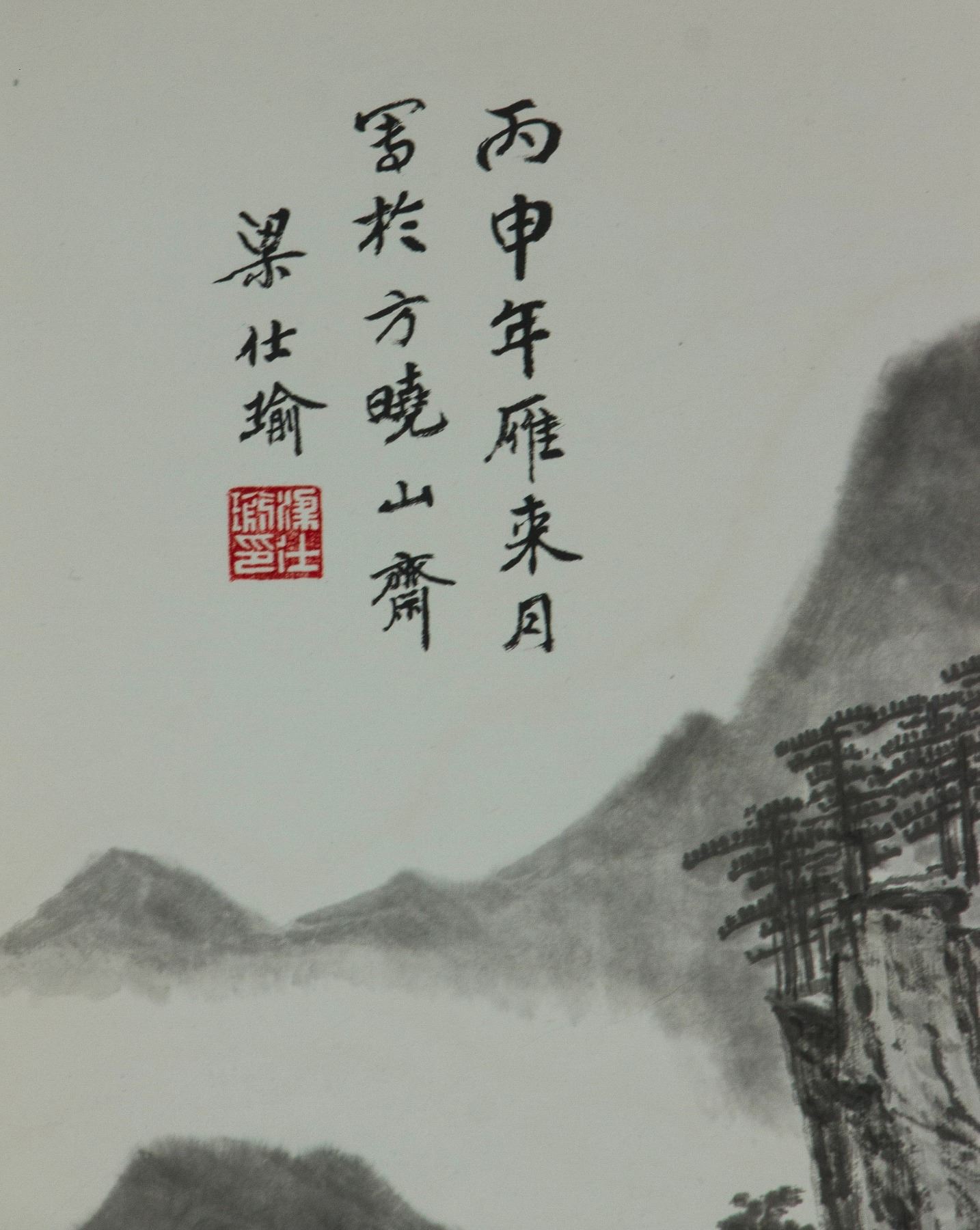 Mountainous landscape with pine trees; Chinese ink on paper; signed Liang Shiyu (b.1945); inscribed with 2 artist seals; 114 cm × 56 cm