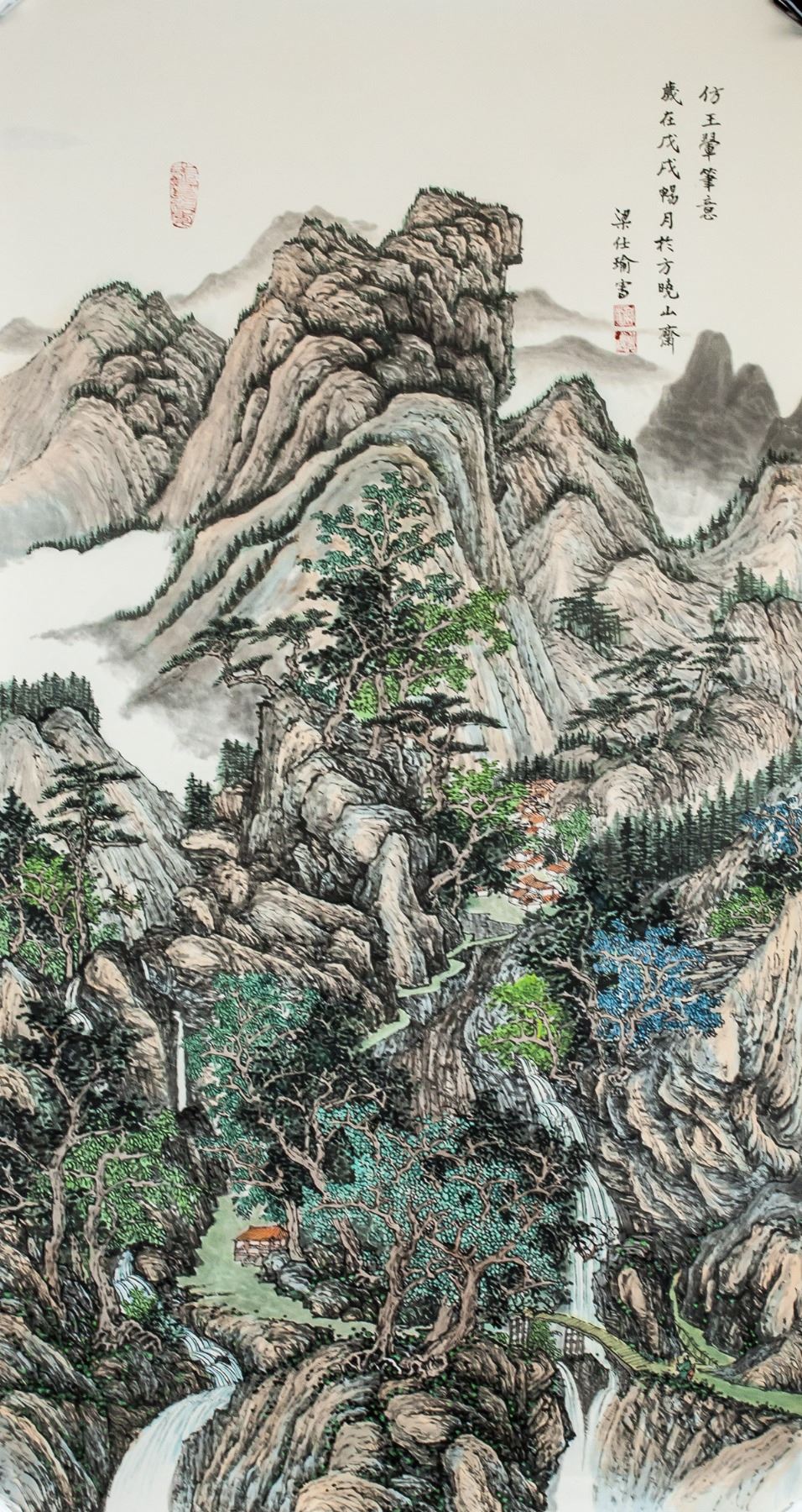 Ink and watercolor on paper roll. Featuring mountainous landscape. Signed by Liang Shiyu b.1945 Chinese, inscribed with 3 artist seals. 109 x 58 cm. Provenance: provided by artist himself.