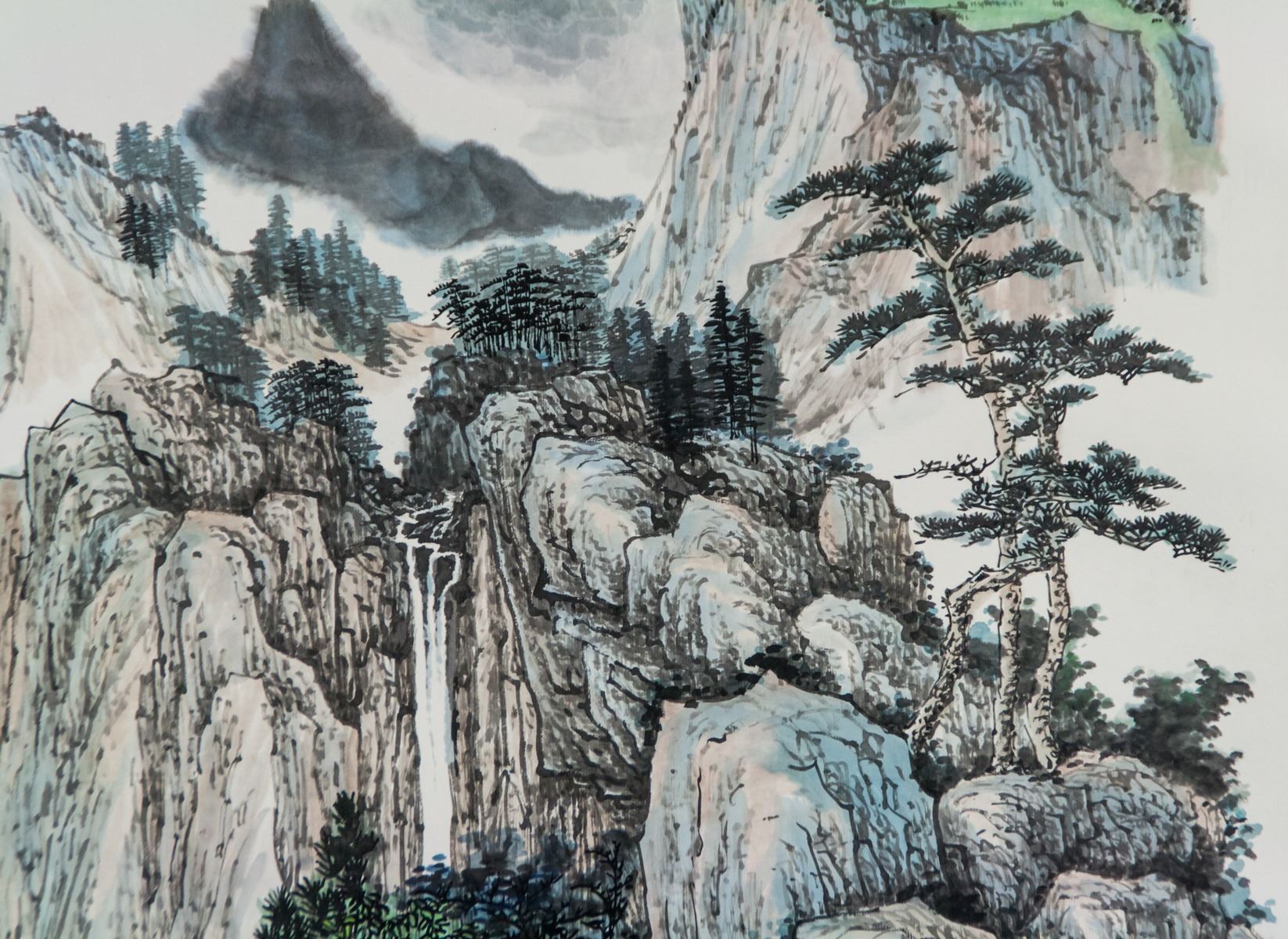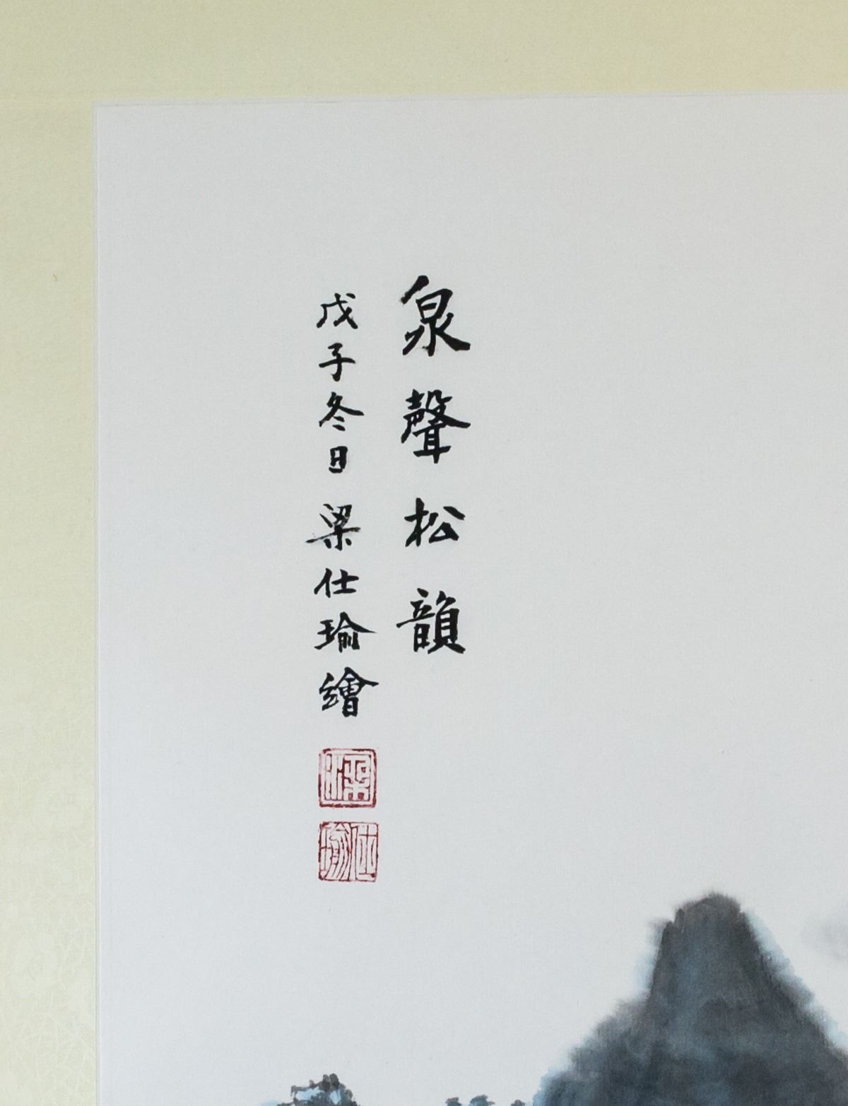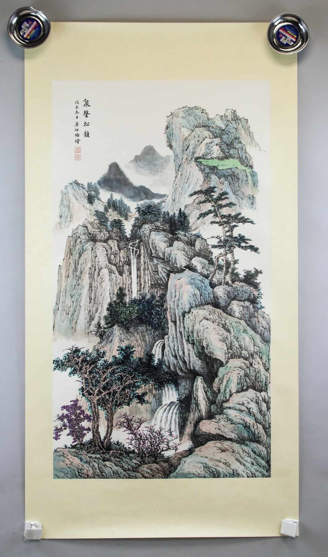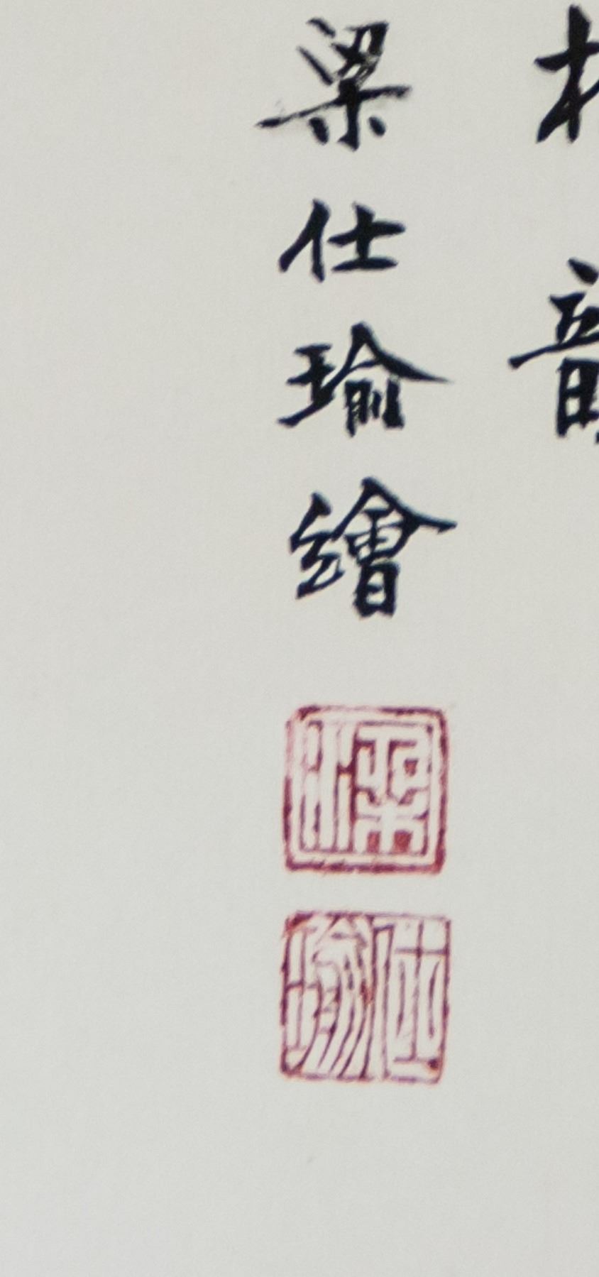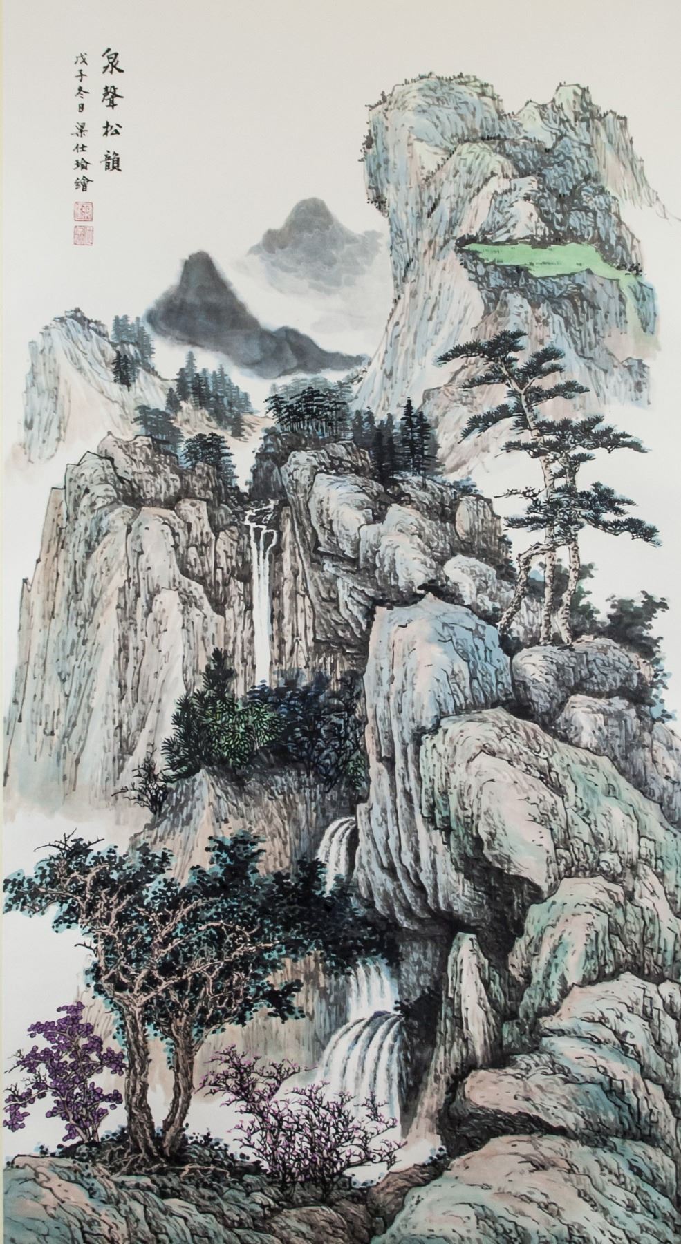 Ink and watercolor on paper roll. Featuring mountainous landscape. Signed Liang Shiyu (b.1945, Chinese), inscribed with 2 artist seals. 102 x 56 cm