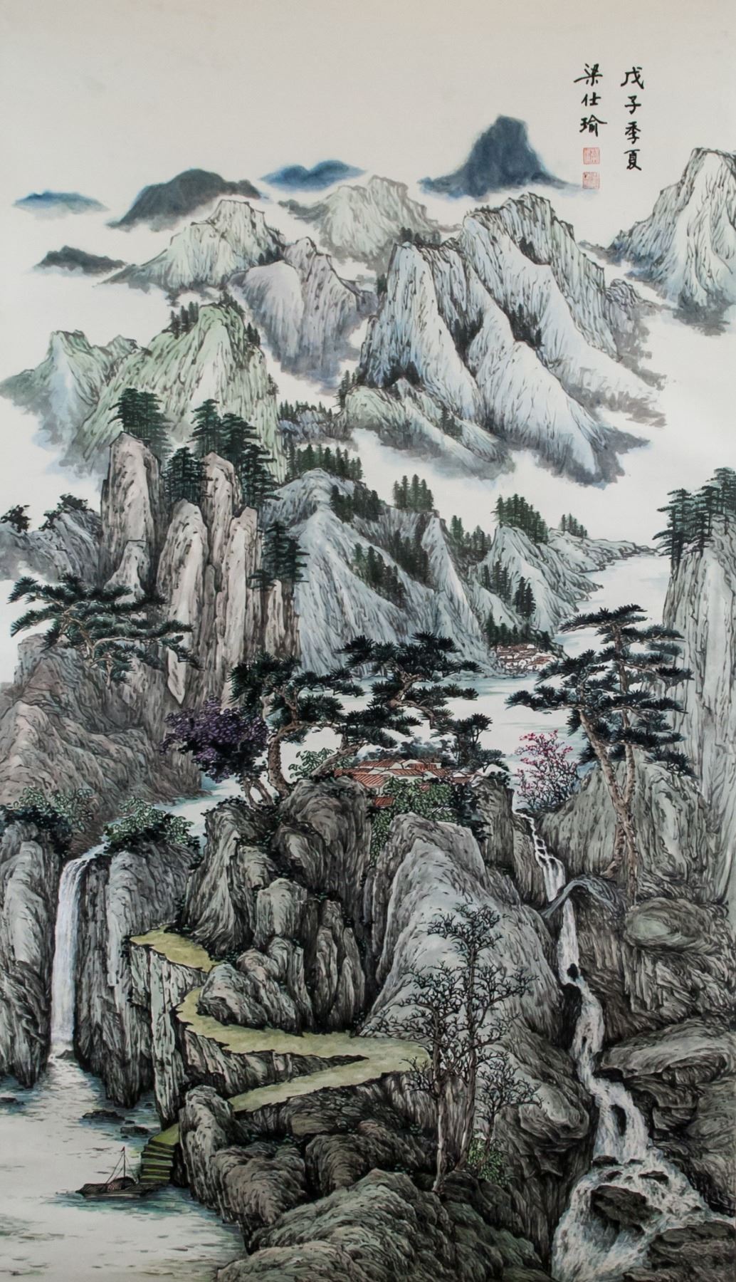 Ink and watercolor on paper roll. Featuring mountainous landscape. Signed Liang Shiyu (b.1945, Chinese), inscribed with 2 artist seals. 121 x 70 cm