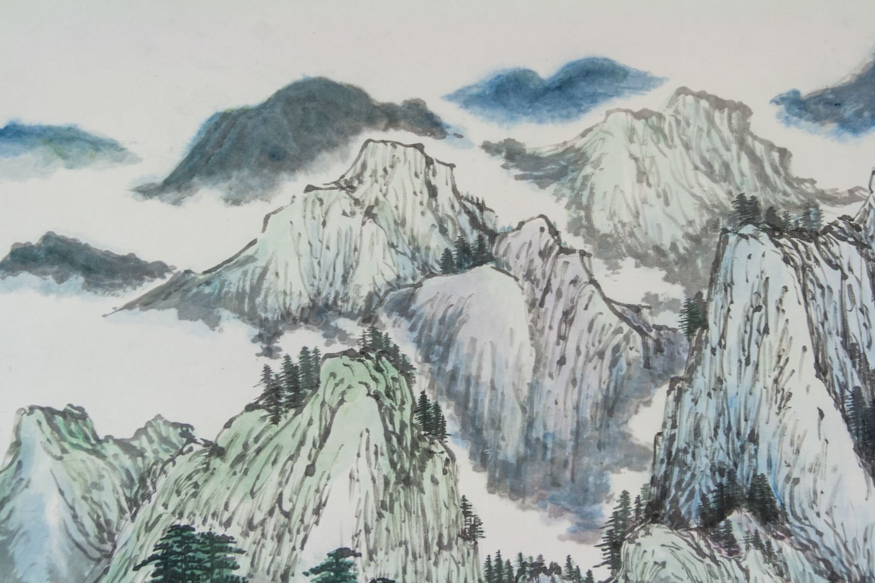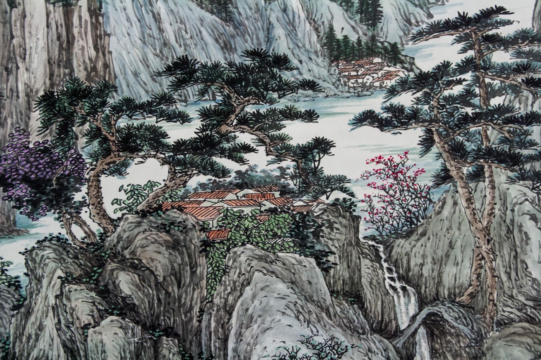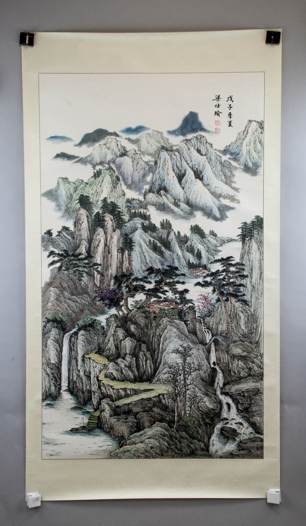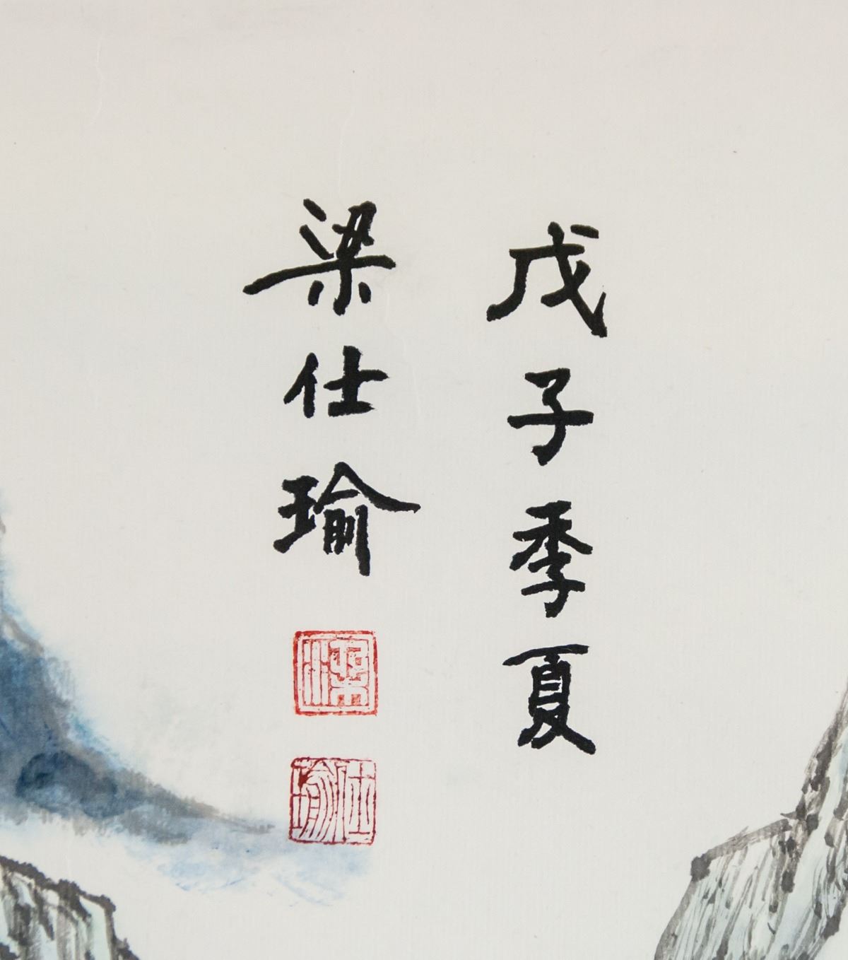 Ink and watercolor on paper roll. Featuring mountainous landscape. Signed Liang Shiyu (b.1945, Chinese), inscribed with 2 artist seals. 121 x 70 cm