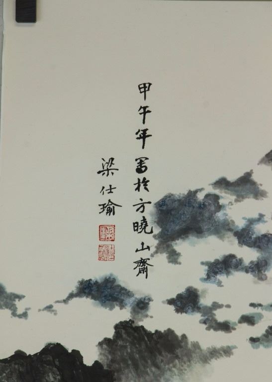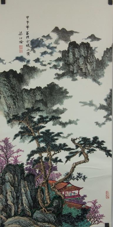 Mountainous landscape with pine trees and pavilion; Chinese ink and watercolour on paper; signed Liang Shiyu (b.1945); inscribed with 3 artist seals; 111 cm × 56 cm