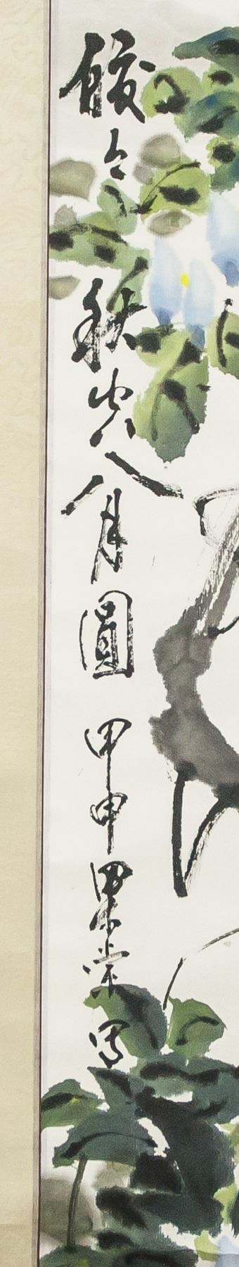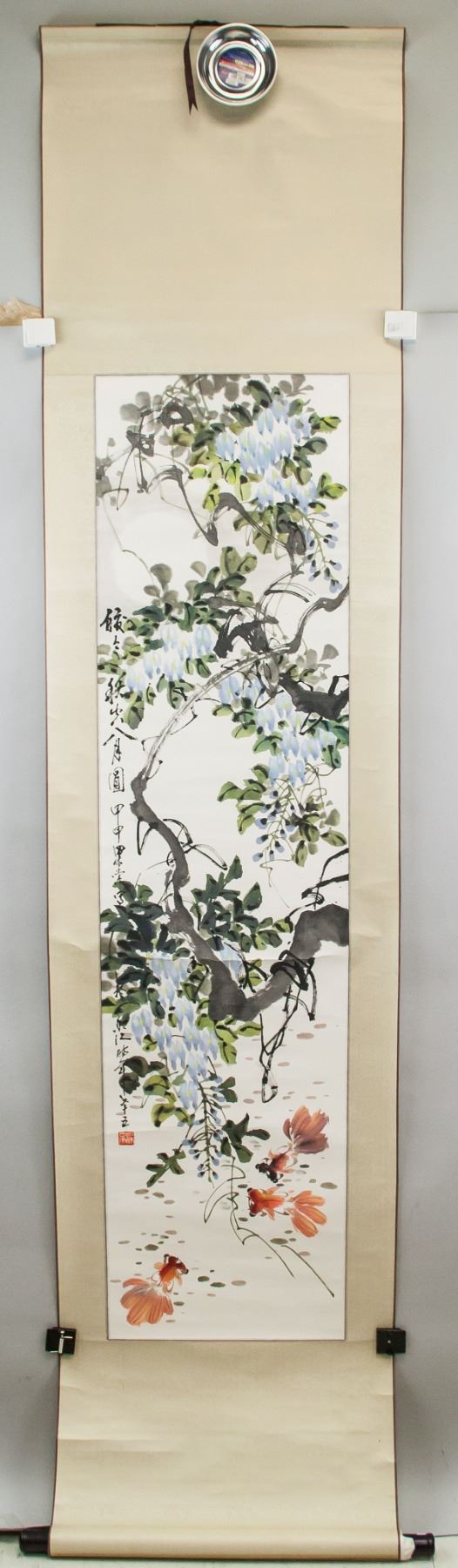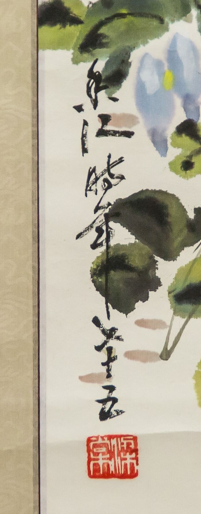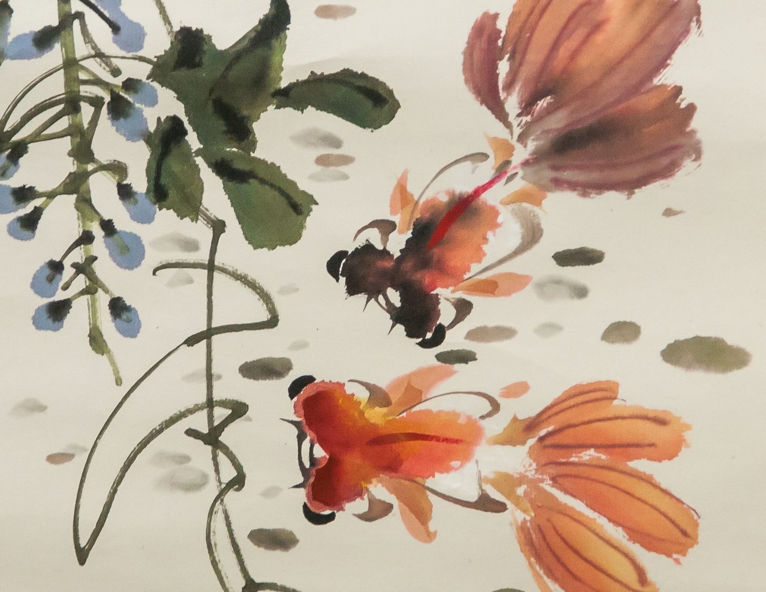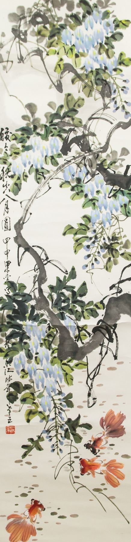 Ink and watercolor on paper, hanging scroll. Featuring gold fish and morning glories. Signed Liang Tang (20th century, Chinese), inscribed with 1 artist seal. 138 x 134 cm