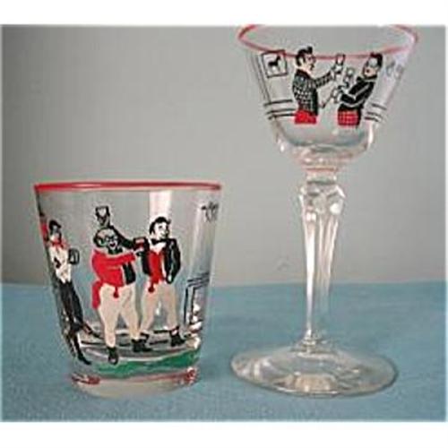 This great deco set of 6 cocktail and 6 old fashion glasses have the Libbey L mark on the bottom. From the 1950s they are in great condition with all the colors bright and in tact. The cocktail glasses have a bar scene with 2 men toasting in black/white and red and measure 5 1/16 inches with a 2 7/8 inch rim. The old fashioned glasses have a bar scene with 3 men drinking in black/white/red and green and they measure 3 3/16 with a 2 7/8 inch rim. Price quoted is for the set of 12. A nice addition to any collection.<BR>SH & Ins. will be quoted after orders placed. If you have questions please contact me and thank you for looking.