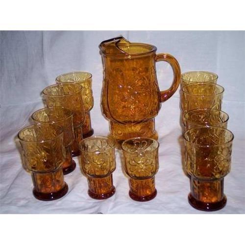 Country Garden by Libbey Rock Sharpe from the early seventies. Set includes 10" tall pitcher, four 6" tall iced teas, five 5" tall 12 ounce tumblers and two 4" tall juice glasses. All in excellent condition. Pitcher has a slight manufacturing flaw in bottom which doesn't effect the looks or functionality of the piece.