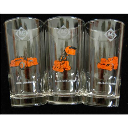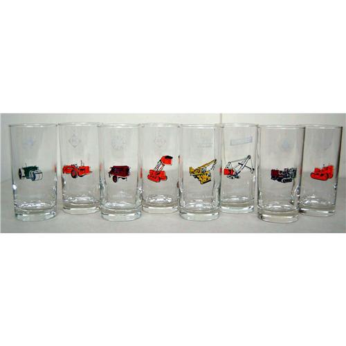Set of 8 glasses, original box, 3 Allis chalmers, Cleveland trencher, Gradall, Northwest shovel, Jaeger compressor, Buffalo-Springfeild roller.