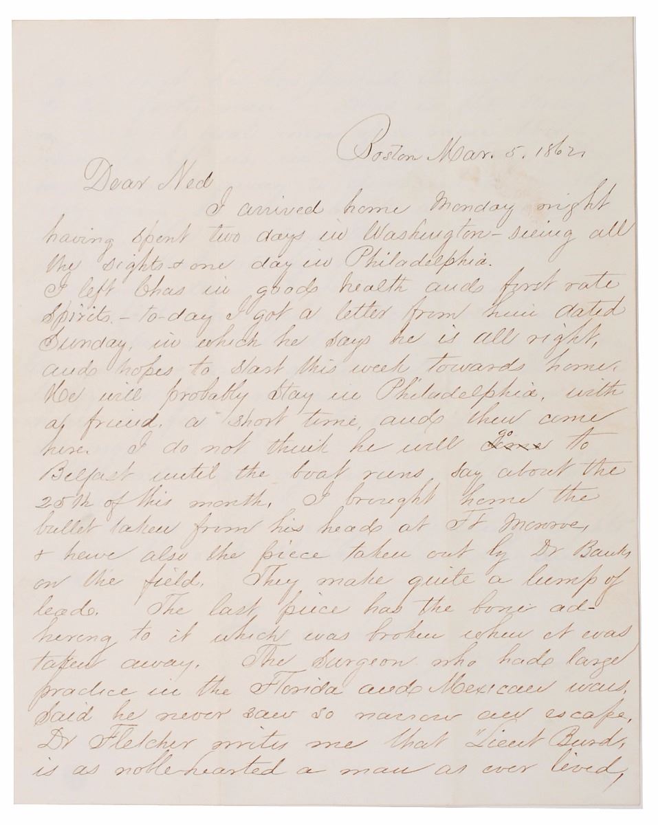 Fascinating collection of material related to Lt. Charles H. Burd, 4th Maine Volunteers, who was shot in the head at the First Battle of Bull Run on July 21, 1861, captured by the rebel forces, and held in the Confederacy’s notorious Libby Prison for nine months before an exchange back to the Union. The group is comprised of letters related to Burd’s wound and recovery, the bullet fragments that were surgically removed from his skull, various related ephemera, and some personal effects. Included is an LS from Lorenzo Thomas to Vice President Hannibal Hamlin, January 21, 1862, in part: “Major General Wool has been directed to propose the exchange of Lieutenant Charles H. Burd…for some person held as a prisoner by the United States.” This must have been in response to an ALS by Hamlin, also present, dated a month earlier, stating that he will “call the attention of the Secy of War to the case of Lieut Burd.”
