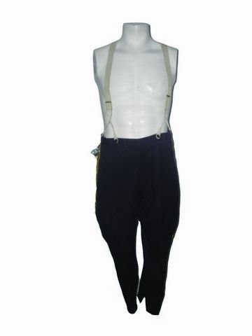 Only Liberace could pull this off. A pair of zipper and clasp front blue pants with white suspenders. The pant legs have yellow trim running down the length and is studded with faux gold crystals and other decorations. There is an electric plug-in behind the right hip that was used to make his pants actually light up!