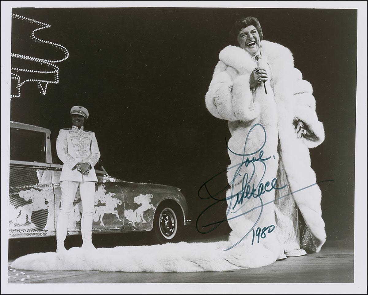 Glossy 10 x 8 photo of the flamboyantly dressed entertainer on stage in a long fur coat, signed in black felt tip “Love, Liberace 1980.” In fine condition.