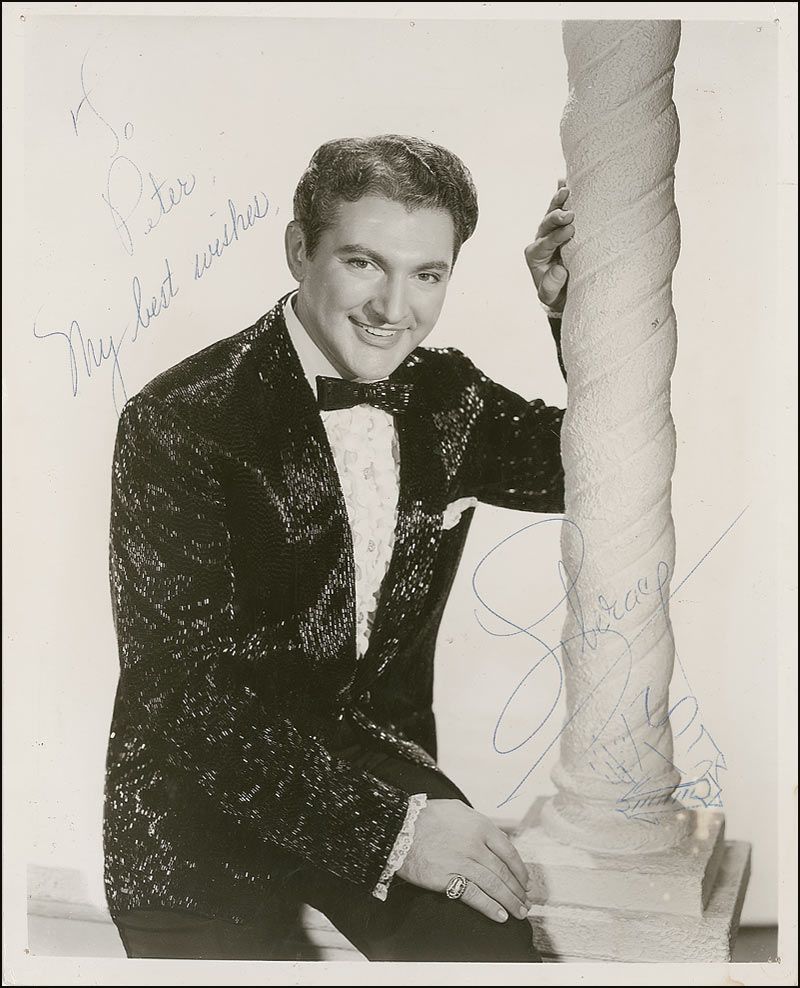 Vintage glossy 8 x 10 photo, signed and inscribed in blue ballpoint “To Peter, My best wishes, Liberace,” adding a quick candelabra sketch. In very good condition, with scattered creases and surface marks, tack holes to each corner tip, some light toning to borders, and mild curling to horizontal edges.