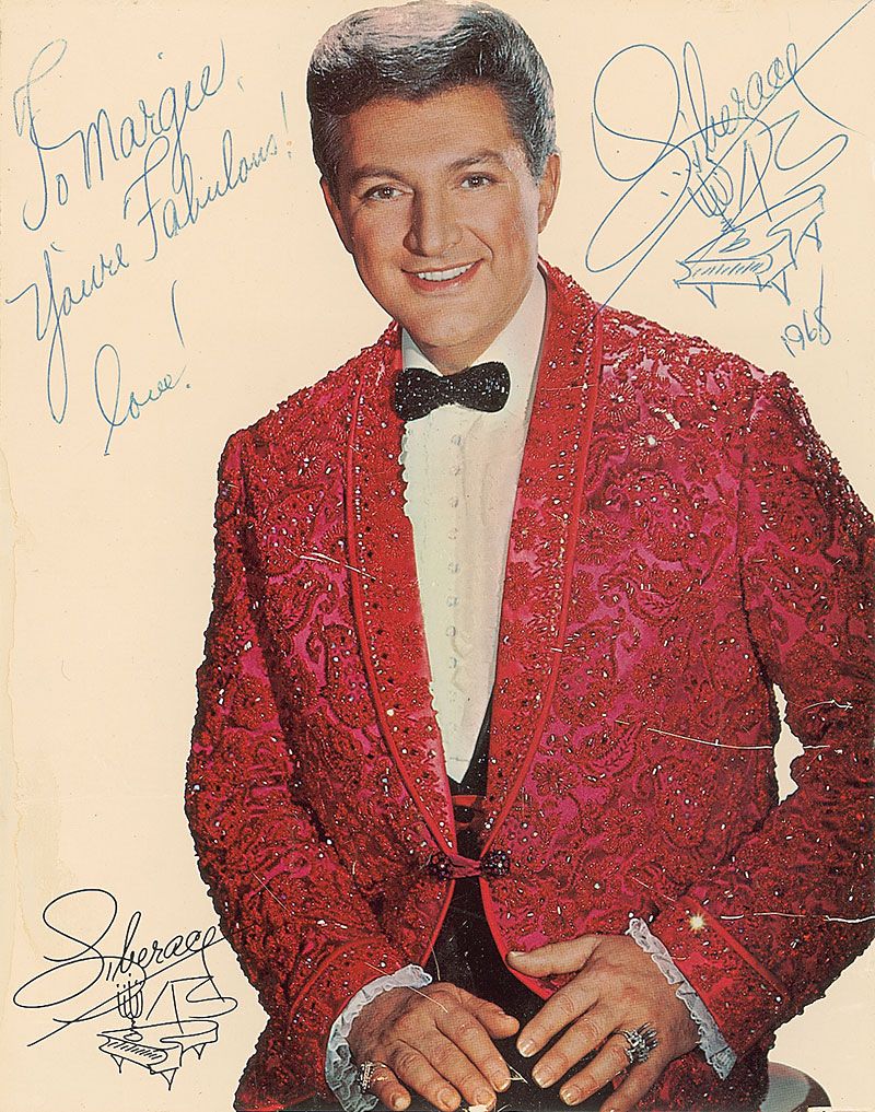 Color 8 x 10 cardstock photo of Liberace in a studded jacket and bow tie, signed and inscribed in blue ballpoint “To Margie, You’re fabulous! Love! Liberace, 1968,” adding a great piano and candelabra sketch under his signature. In very good condition, with scattered bends, creases, and surface marks, and a PSA/DNA authentication label affixed to reverse.