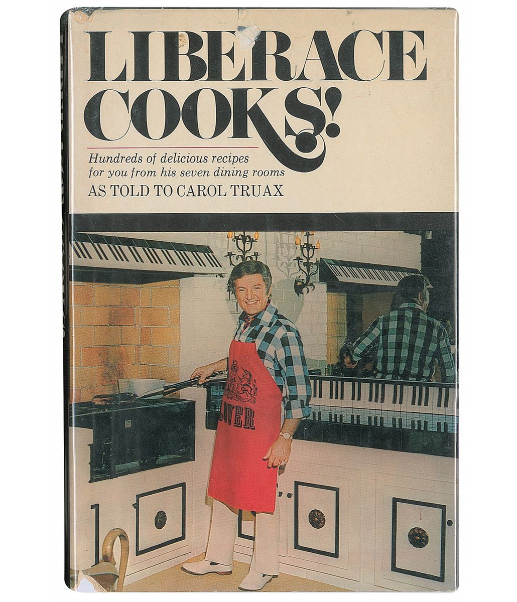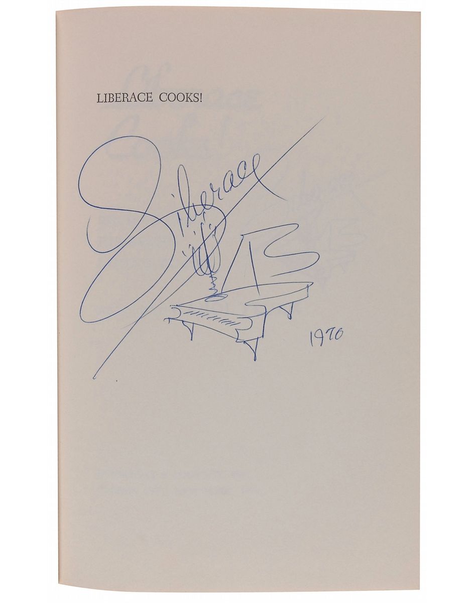 Signed book: Liberace Cooks! First edition. Garden City, NY: Doubleday, 1970. Hardcover with dust jacket, 6.5 x 9.5, 225 pages. Signed on the half-title page in blue ballpoint, “Liberace, 1970,” with a sketch of a piano below. In fine condition, with a few tears and clipped price to dust jacket.