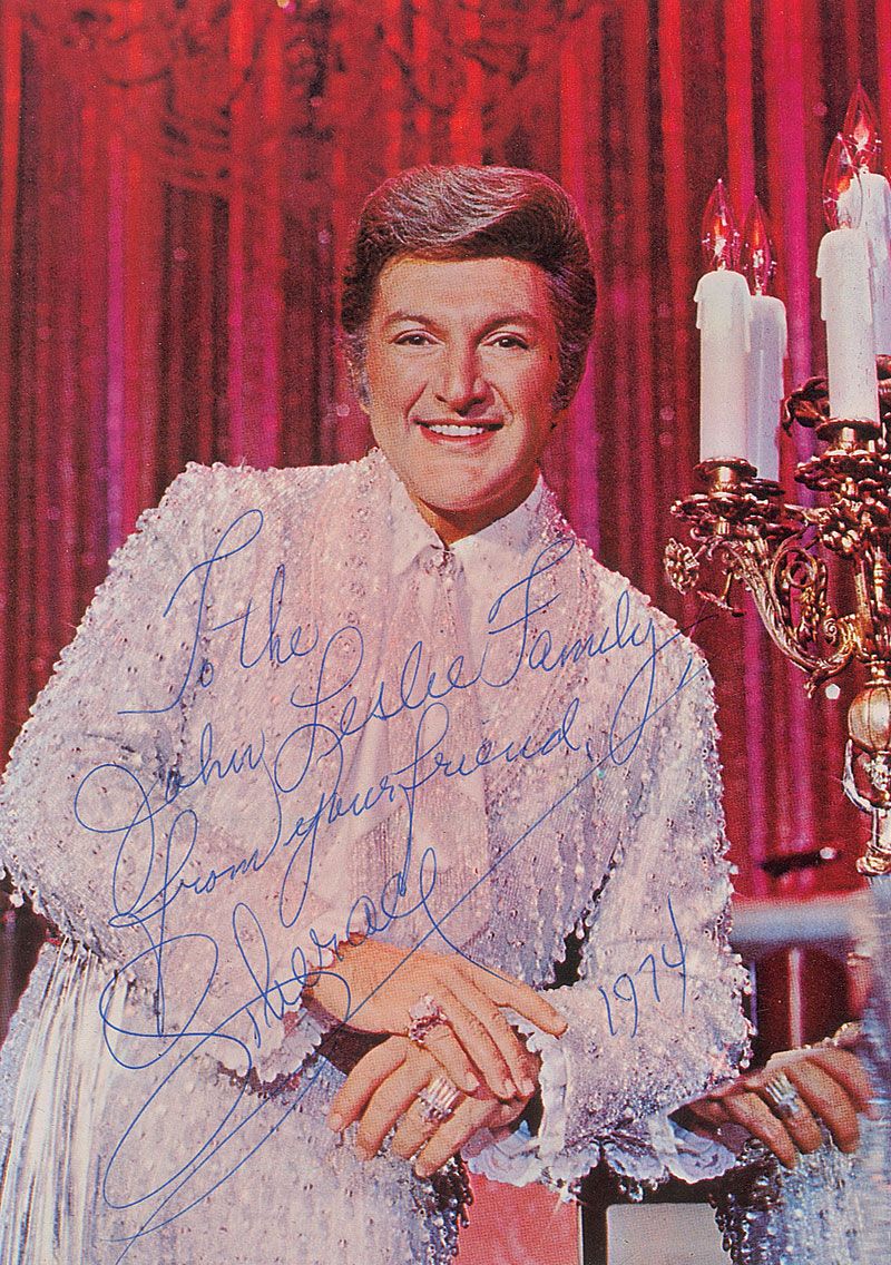 Color 7 x 10 cardstock photo of Liberace in a rhinestone suit, signed and inscribed in blue ballpoint, “To the John Leslie Family from your friend, Liberace 1974.” Photo is affixed to an identical size sheet of cardstock. In fine condition.