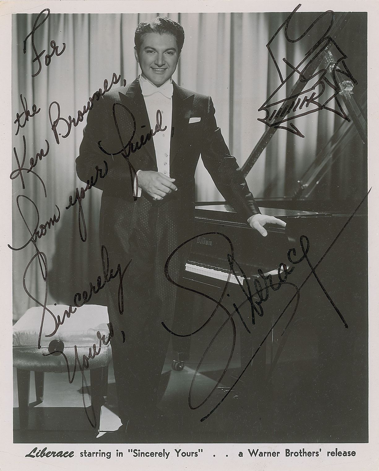 Vintage glossy 8 x 10 Warner Bros. publicity photo of Liberace posing beside his piano, signed and inscribed in black felt tip, "For the Ken Brownes, from your friend, Sincerely yours, Liberace.” He sketches his typical grand piano in the upper right. Reverse bears typed collector's notations indicating that it was received in 1956. In very good to fine condition, with scattered light creasing. Accompanied by an unsigned candid photograph of Liberace taken in Iowa in 1954.