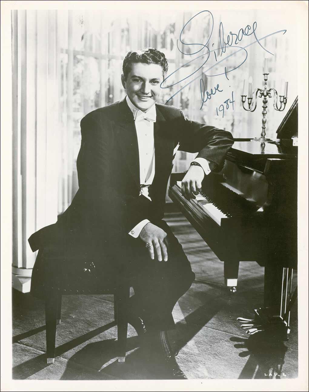 Glossy 8 x 10 photo of a younger Liberace seated at his piano, signed in black felt tip, “Liberace, Love! 1984.” Some light creasing to corner tips and edges, otherwise fine condition.