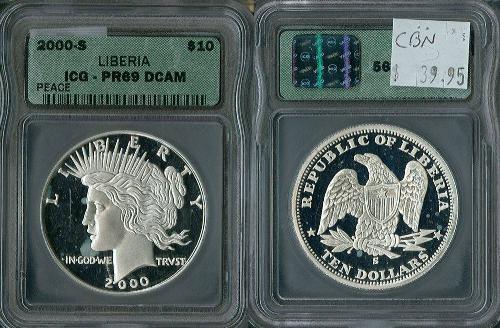 Liberia 2000-S $10 Peace type ICG PR69 DCAM; Beautiful piece struck with 1 oz .999 fine silver, certified!
