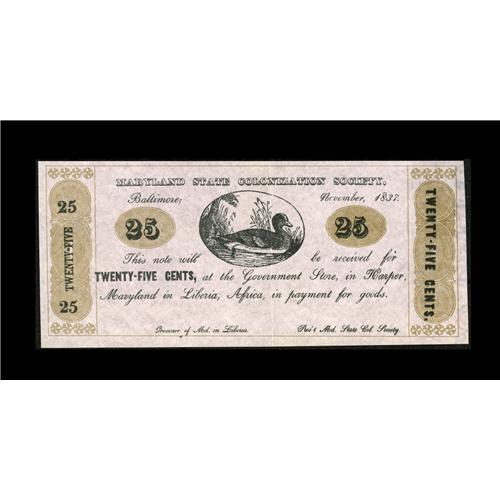 <B>Liberia</B></I> 25¢ Maryland State Colonization Society November 1837 Pick S113rp<BR>This is only one of 100 notes that were reprinted in 1885, and the original plates destroyed thereafter. The watermark is detected just on the right edge of this scarce and seldom-seen issue. <B>About Uncirculated</B></I>.