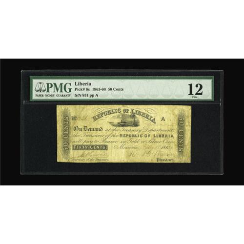<B>Liberia</B></I> 50¢ Republic of Liberia Feb. 18, 1864 Pick 6c<BR>Liberia issued currency from 1857 through 1880, and did not issue again until 1989, as the US Dollar freely circulated along with British West African currencies. Simply rare in any condition, we offer this <B>PMG Fine 12</B></I> example.