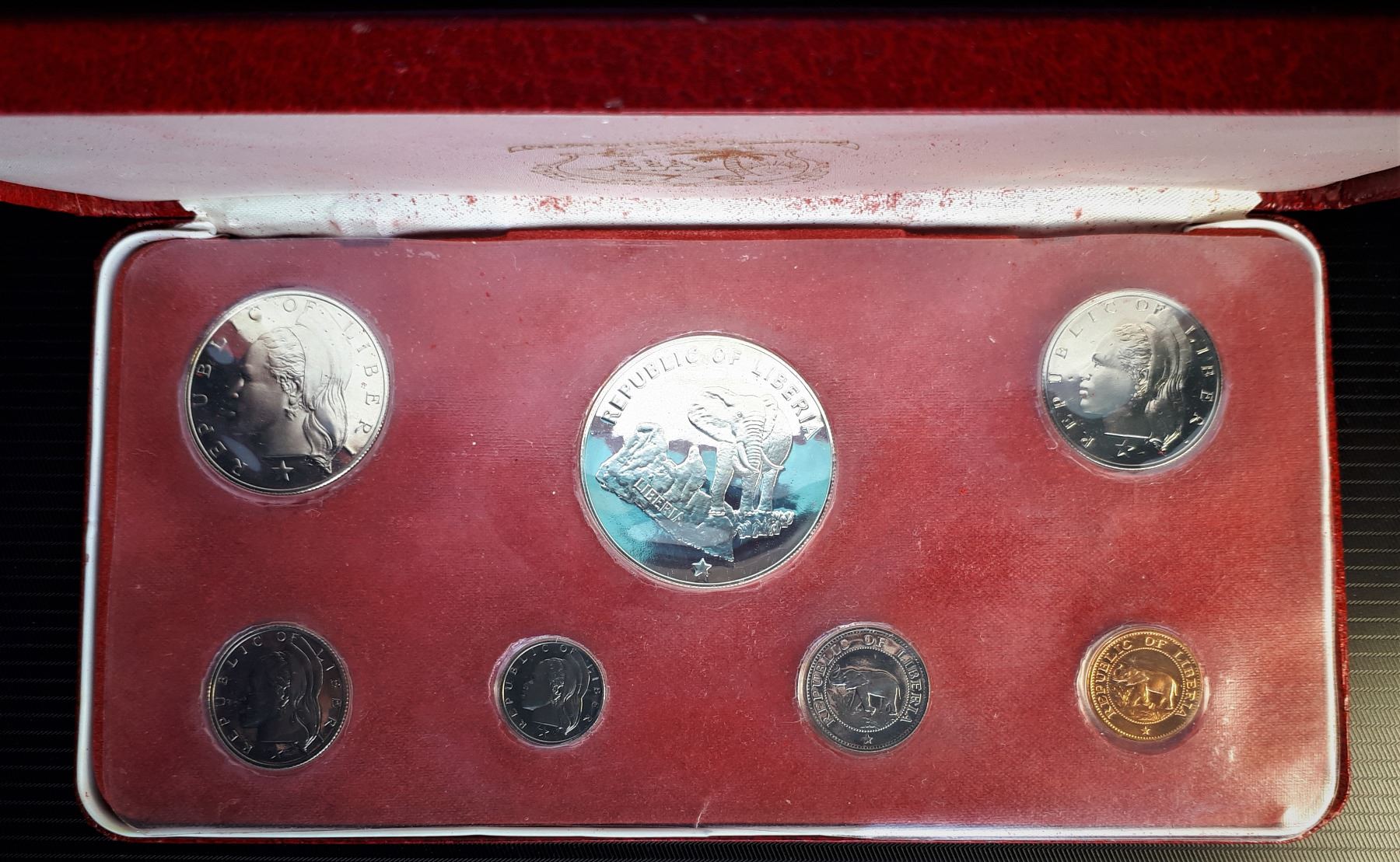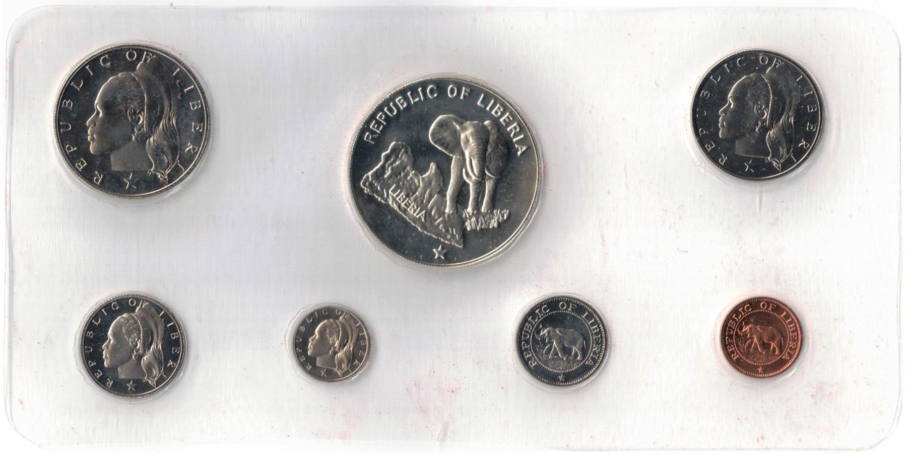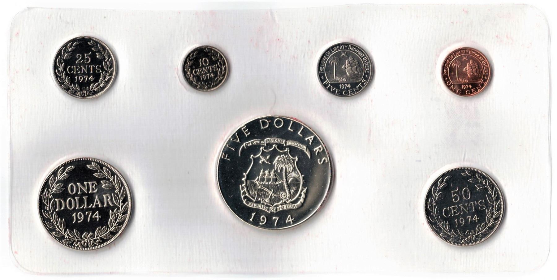 Liberia, Proof set 1974 from 1c to $5 (the $5 is 1 Oz all in original Presentation Box as issued (7) Sealed Coins.