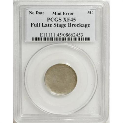 <B>Undated 5C With Cents Liberty Nickel--Full Late Stage Brockage--XF45 PCGS.</B></I> This partly lustrous slate-gray Liberty nickel has a normal reverse. The obverse shows an incused, reversed, and distorted impression of the reverse, as made. A previously struck nickel (not included) clung to the obverse die (as an obverse die cap), and its reverse served as a die to a series of newly fed planchets, one of which became the present coin. The reverse of the die cap became blurry and distorted as the strikes progressed.<BR><BR><B>Coin Engraver:</B> Charles E. Barber<BR><BR><b>Shipping:</b> Coins & Currency (<a target="_blank" href="http://www.heritageauctions.com/common/shipping.php">view shipping information</a>)