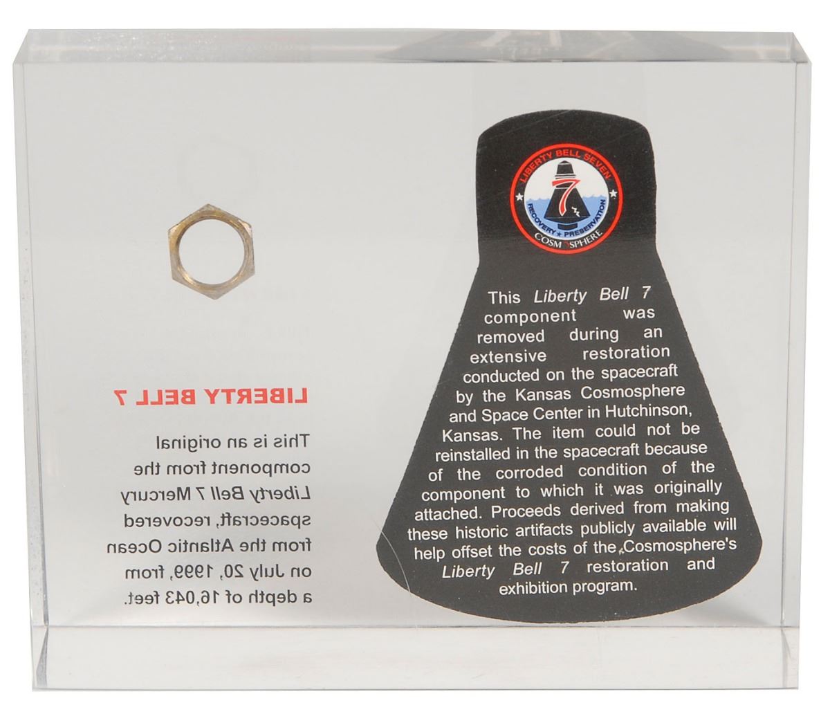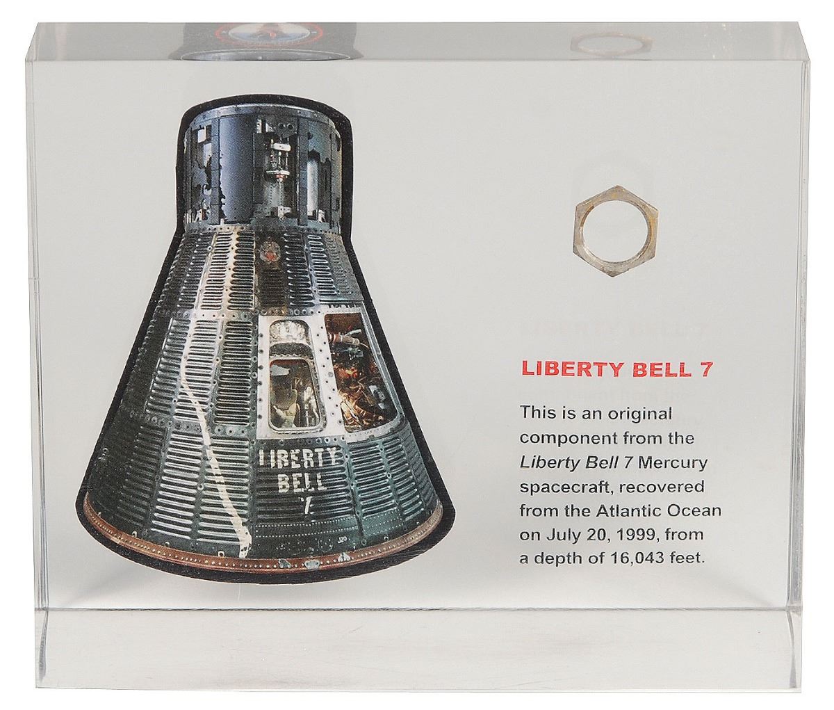 Flown original component from Gus Grissom’s Liberty Bell 7 Mercury spacecraft, recovered from the Atlantic Ocean on July 20, 1999. The piece measures approximately .5? in diameter and is presented inside a 5.25 x 4.25 x 1.5 acrylic display with an image of the spacecraft as well as printed information about the recovery. In fine condition.