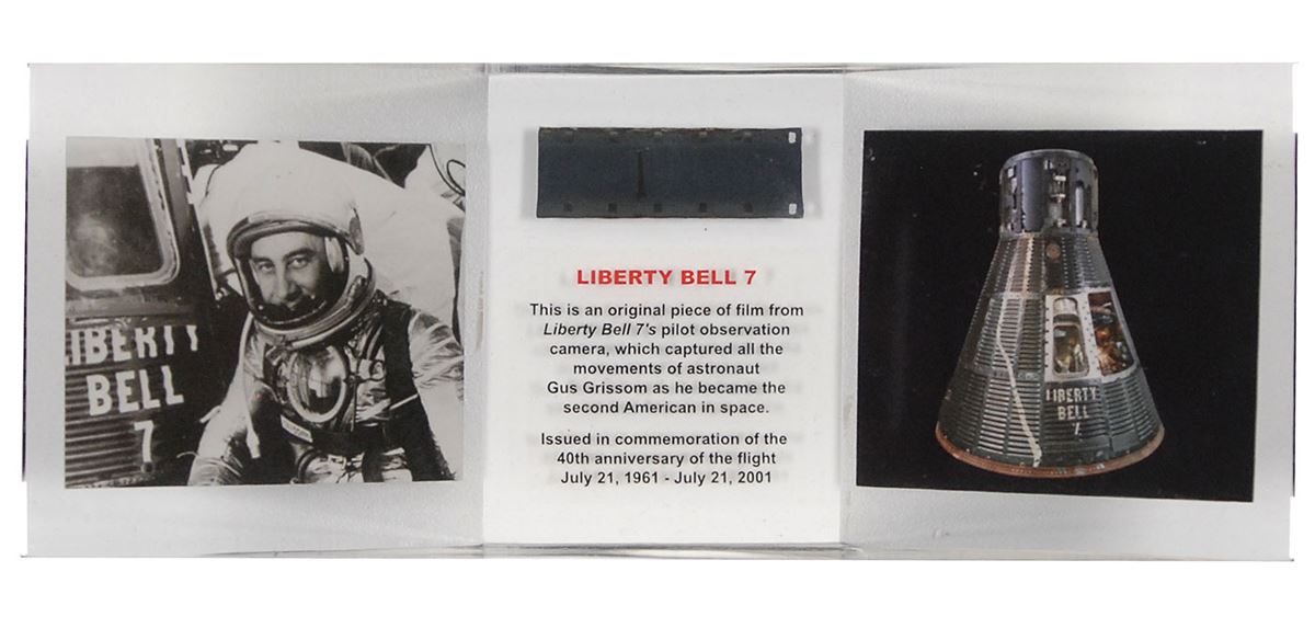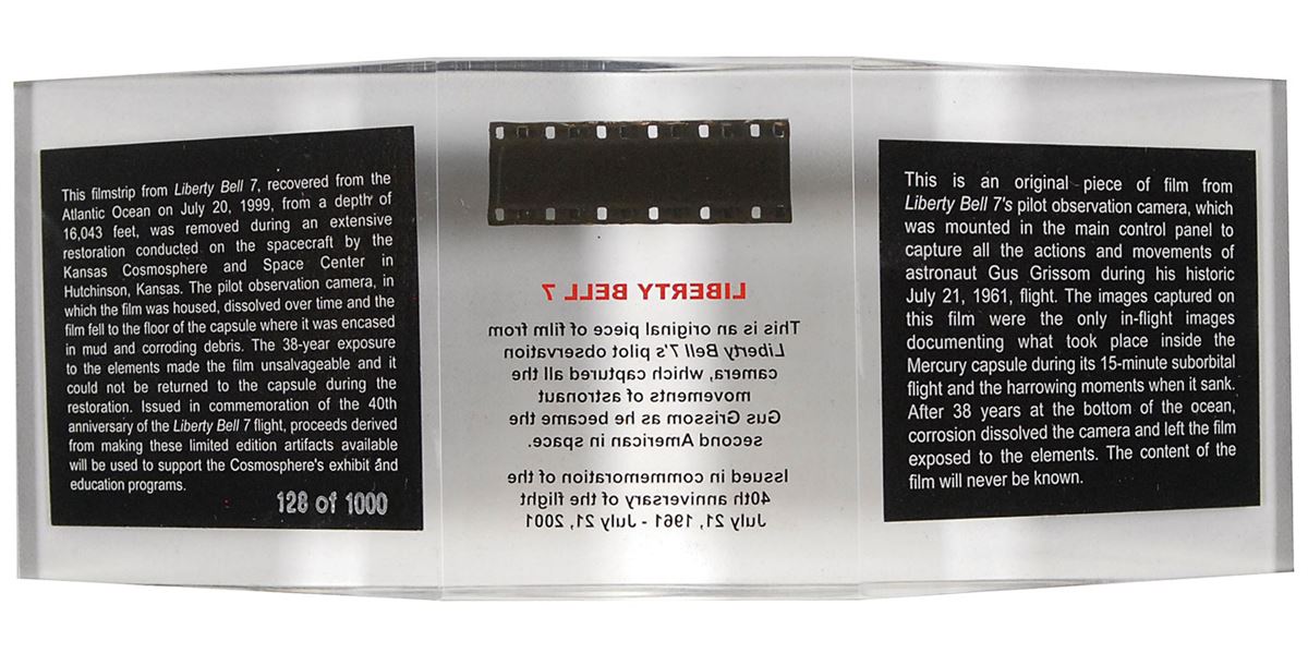 A limited edition presentation containing a 1.5? long segment of film from Liberty Bell 7’s pilot observation camera, recovered from the Atlantic Ocean on July 20, 1999, from a depth of 16,043 feet. Strip is housed in a triangular acrylic, #128/1000, with an image of the space craft, and Gus Grissom, and two explanatory plaques on the reverse, stating that the film contained the only images of Grissom during his flight and the harrowing moments after splashdown, and was issued in commemoration of the 40th anniversary of Grissom’s flight by the Kansas Cosmosphere. In fine condition. Accompanied by its original box and certificate of authenticity from the Kansas Cosmosphere.