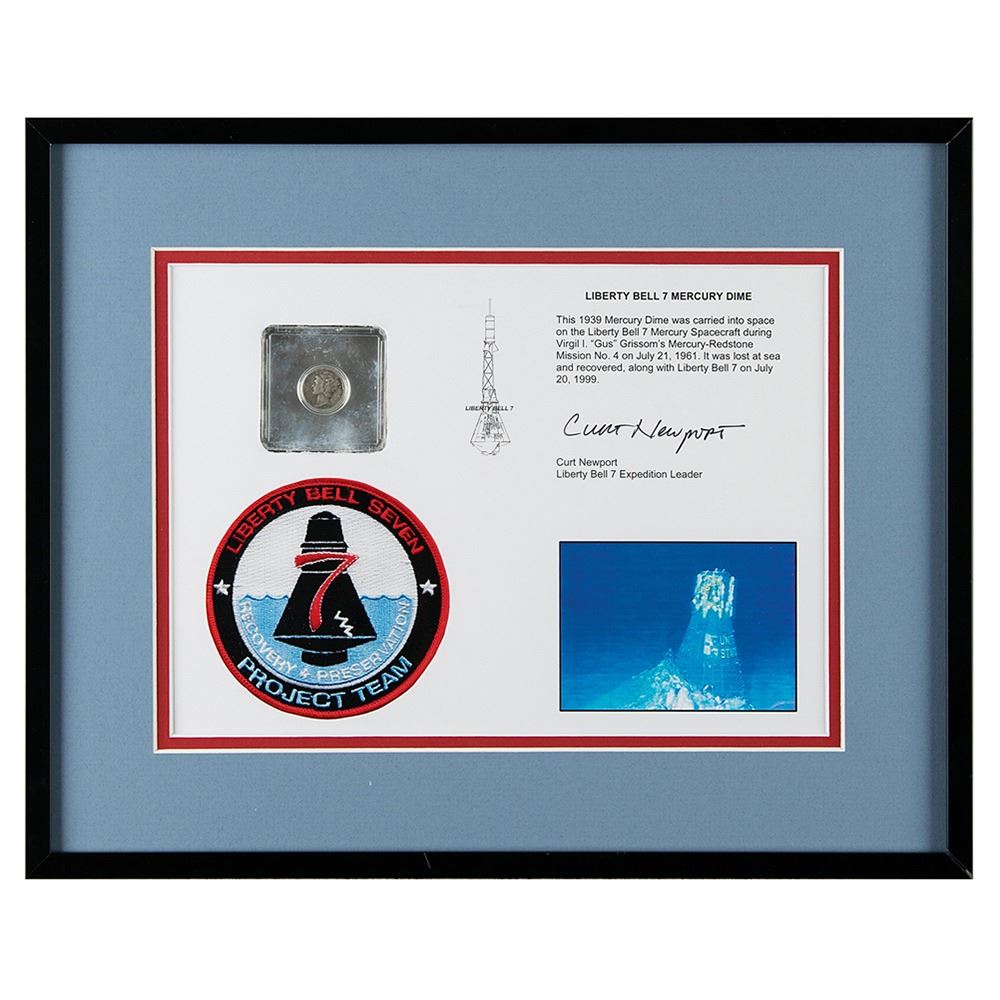 Flown 1939 Mercury dime, one of 52 ten-cent coins that were carried aboard the Liberty Bell 7 with astronaut Gus Grissom during the Mercury-Redstone 4 mission and recovered from the bottom of the Atlantic Ocean 38 years after splashdown. The coin is encapsulated, mounted, and displayed within a flight-certified presentation sheet signed in black felt tip by Curt Newport, the team leader of the Liberty Bell 7 expedition team, who states: ‰ÛÏThis 1939 Mercury Dime was carried into space on the Liberty Bell 7 Mercury Spacecraft during Virgil I. ‰Û÷Gus‰Ûª Grissom‰Ûªs Mercury-Redstone Mission No. 4 on July 21, 1961. It was lost at sea and recovered, along with Liberty Bell 7 on July 20, 1999.‰Û Double-matted and framed to an overall size of 15.25 x 12.5; window to frame backing reveals a back view of the coin.
