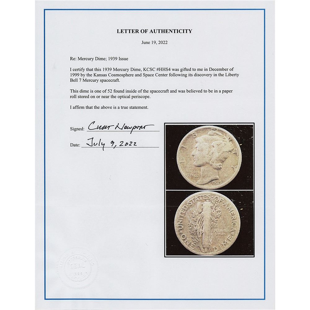 Accompanied by a signed letter of authenticity from Newport, who states: ‰ÛÏI certify that this 1939 Mercury Dime, KCSC #HHS4 was gifted to me in December of 1999 by the Kansas Cosmosphere and Space Center following its discovery in the Liberty Bell 7 Mercury spacecraft. This dime is one of 52 found inside of the spacecraft and was believed to be in a paper roll stored on or near the optical periscope.‰Û