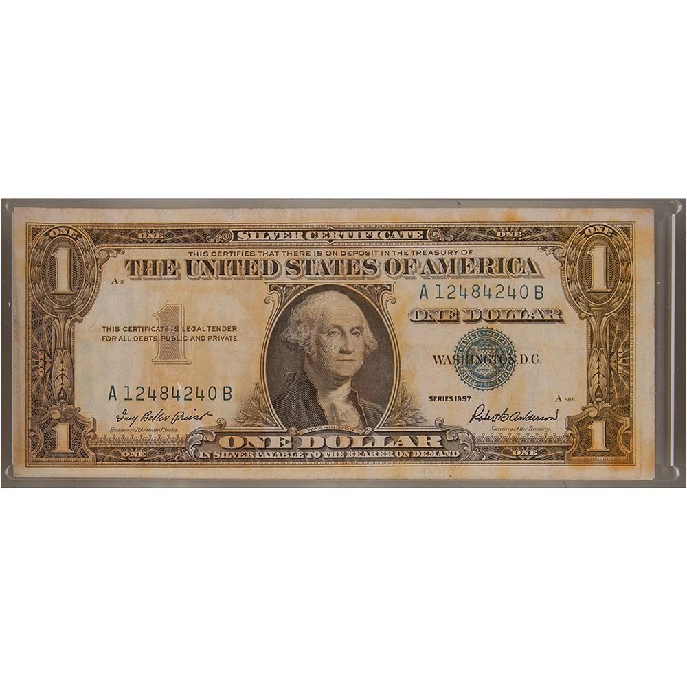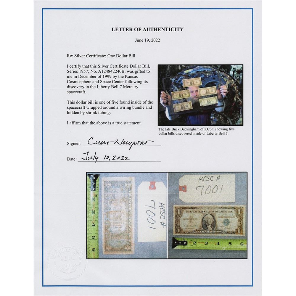 Accompanied by a signed letter of authenticity from Newport, who states: ‰ÛÏI certify that this Silver Certificate Dollar Bill, Series 1957; No. A12484240B, was gifted to me in December of 1999 by the Kansas Cosmosphere and Space Center following its discovery in the Liberty Bell 7 Mercury spacecraft. This dollar bill is one of five found inside of the spacecraft wrapped around a wiring bundle and hidden by shrink tubing.‰Û