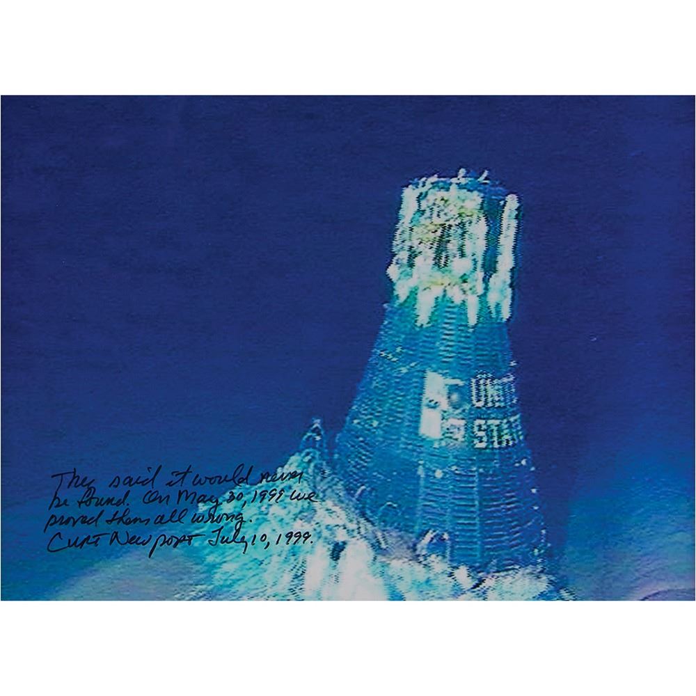 Incredible flown Series 1957 silver certificate one-dollar bill (A1248420B), one of five that were carried aboard the Liberty Bell 7 with astronaut Gus Grissom during the Mercury-Redstone 4 mission and recovered from the bottom of the Atlantic Ocean 38 years after splashdown. The dollar bill is mounted and displayed with color glossy photos of the Liberty Bell 7 resting at the bottom of Blake‰Ûªs Basin, and another of the rusted interior of the spacecraft following its recovery; the former is signed in black felt tip, ‰ÛÏThey said it would never be found. On May 30, 1999, we proved them all wrong. Curt Newport, July 10, 1999.‰Û Matted and framed to an overall size of 16 x 27; the acrylic frame backing reveals a back view of the banknote.