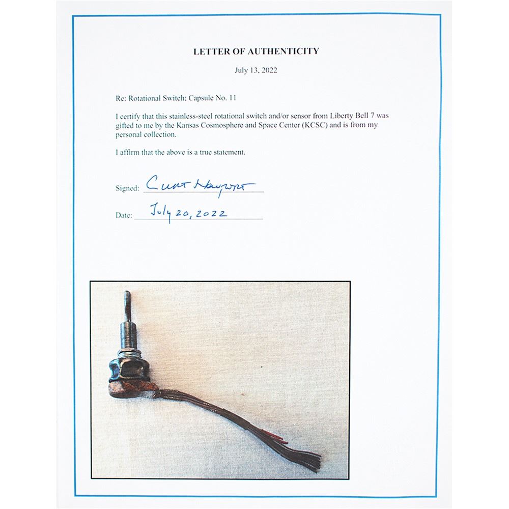 Accompanied by a signed letter of authenticity from Curt Newport, the team leader of the Liberty Bell 7 Recovery Expedition, who states: ‰ÛÏI certify that this stainless-steel rotational switch and/or sensor from Liberty Bell 7 was gifted to me by the Kansas Cosmosphere and Space Center (KCSC) and is from my personal collection.‰Û