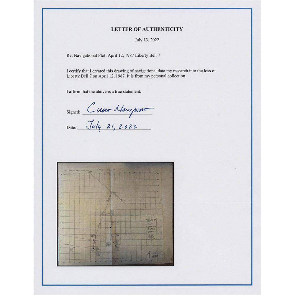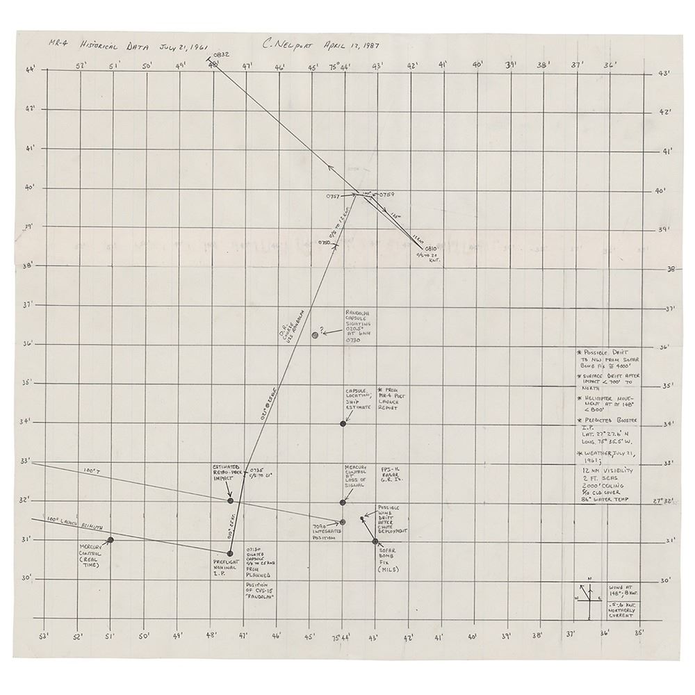 Fascinating hand-drawn plotting chart by Curt Newport, who created this navigational aid as team leader of the Liberty Bell 7 Recovery Expedition. Accomplished in pencil on an off-white 17 x 16 sheet, the chart is headed ‰ÛÏMR-4 Historical Data, July 21, 1961, 0832" and features numerous plotting points for areas of interest, such as ‰ÛÏRandolph Capsule Sighting,‰Û ‰ÛÏCapsule Location; Ship Estimate, *From MR-4 Post launch Report,‰Û ‰ÛÏMercury Control at Loss of Signal,‰Û ‰ÛÏPossible Wind Drift After Chute Deployment,‰Û ‰ÛÏEstimated Retro-Pack Impact,‰Û and ‰ÛÏSofar Bomb Fix (Mils).‰Û Newport has made additional notes to the right side and signed and dated in the upper border, ‰ÛÏC. Newport, April 12, 1987.‰Û In fine condition. Accompanied by a signed letter of authenticity from Newport, who states: ‰ÛÏI certify that I created this drawing of navigational date [for] my research into the loss of Liberty Bell 7‰Û_It is from my personal collection.‰Û