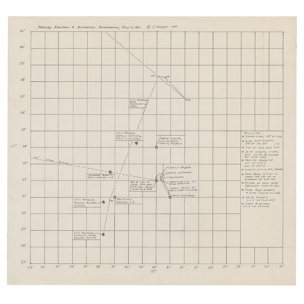 Early circa 1987 hand-drawn navigational chart for the recovery of the Liberty Bell 7 spacecraft, accomplished in graphite on an off-white 17.5è x 16.25è sheet of graphing paper by Curt Newport, the team leader of the Liberty Bell 7 Recovery Expedition that discovered the spacecraft resting on the Atlantic seabed on May 1, 1999. The chart, which is headed ‰ÛÏMercury Redstone-4 Historical Information, July 21, 1961,‰Û features various tracking lines and plotting points annotated as ‰ÛÏU.S.S. Randolph Dead Reckoning Track,‰Û ‰ÛÏCapsule Location, Ship Estimate, Loran A, AN/UPN 12,‰Û ‰ÛÏEstimated Retro-Pack Location,‰Û and ‰ÛÏPre-Flight Nominal I.P.,‰Û with the impact zone marked as ‰ÛÏCapsule Dropped,‰Û ‰ÛÏHatch Jettisoned,‰Û ‰ÛÏSplashdown,‰Û ‰ÛÏCapsule Position at Bomb Detonation,‰Û ‰ÛÏCapsule Position at Bomb Impact in Water,‰Û and ‰ÛÏ(Mils) Sofar Bomb.‰Û Newport adds a list of statistical data to the right and signs in the upper border, ‰ÛÏC. Newport, 1987.‰Û A sofar bomb (Sound Fixing and Ranging), is a long-range position-fixing system that uses impulsive sounds in the deep sound channel of the ocean to enable pinpointing of the location of ships or crashed planes. In fine condition, with some light edgewear.